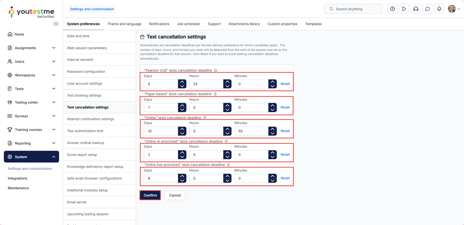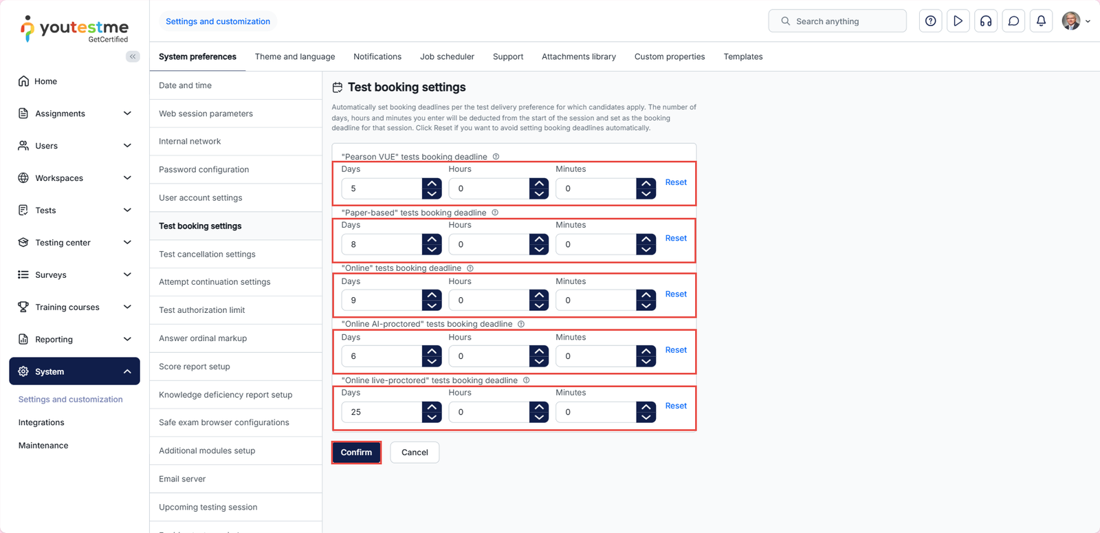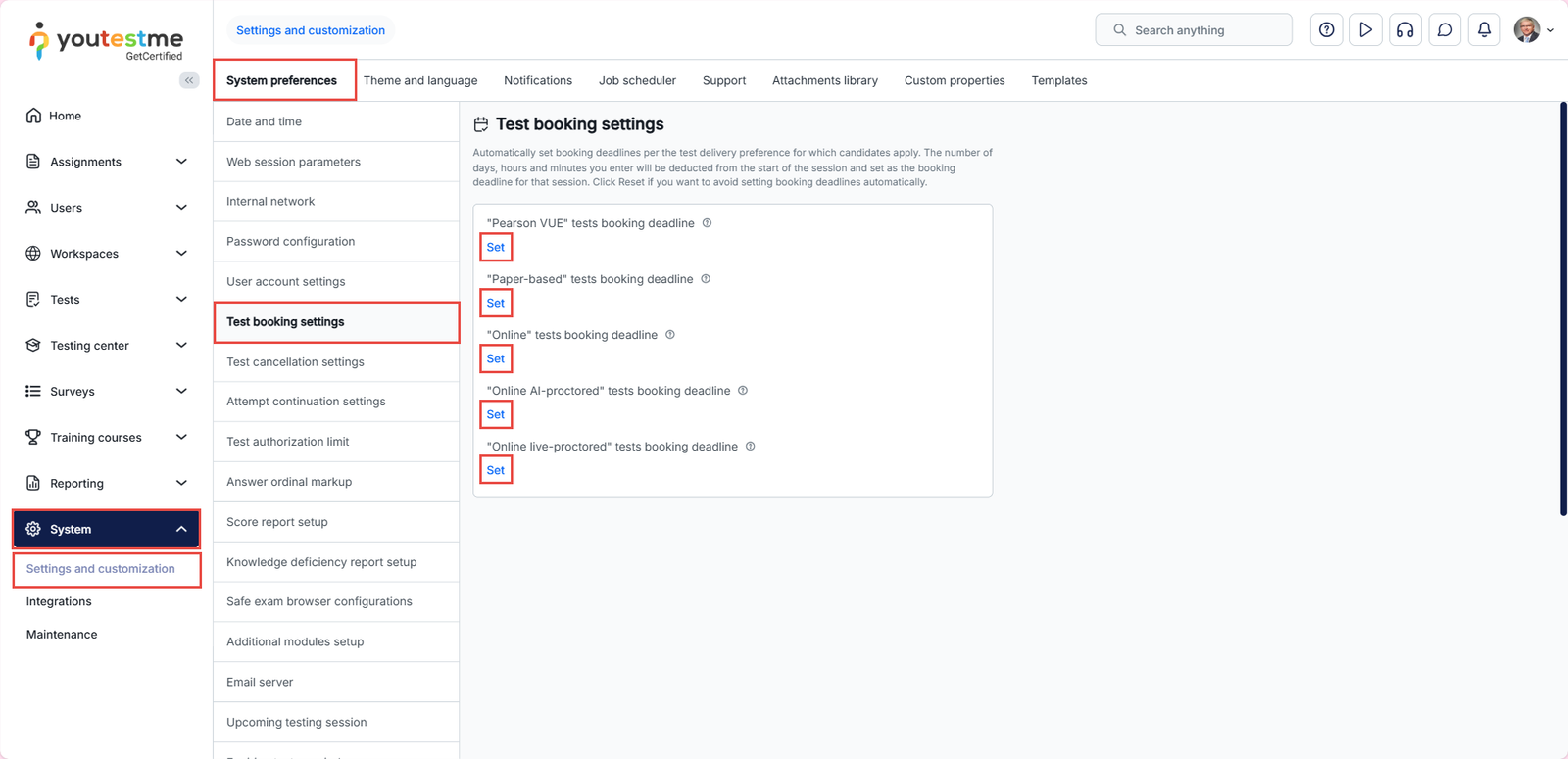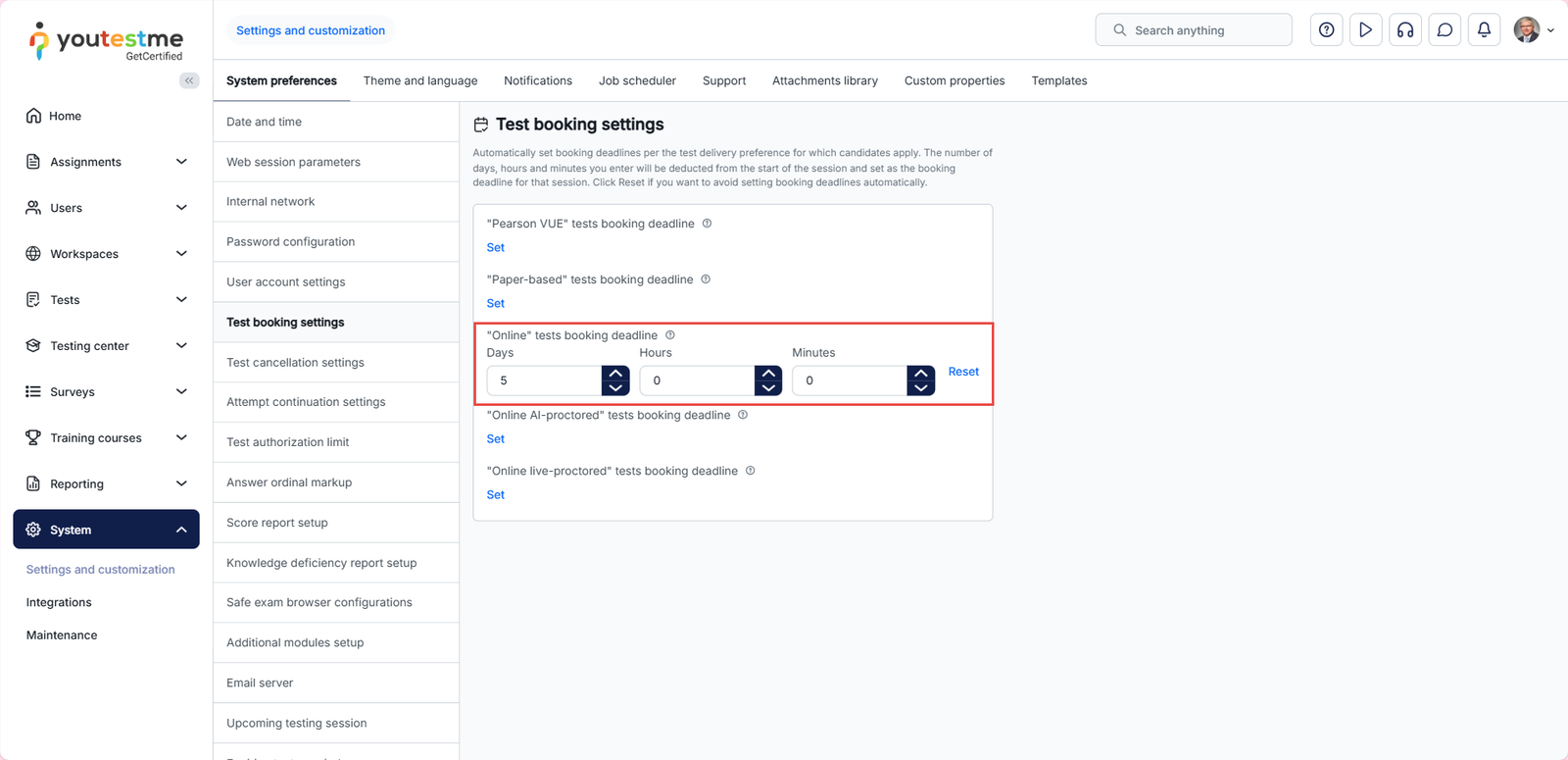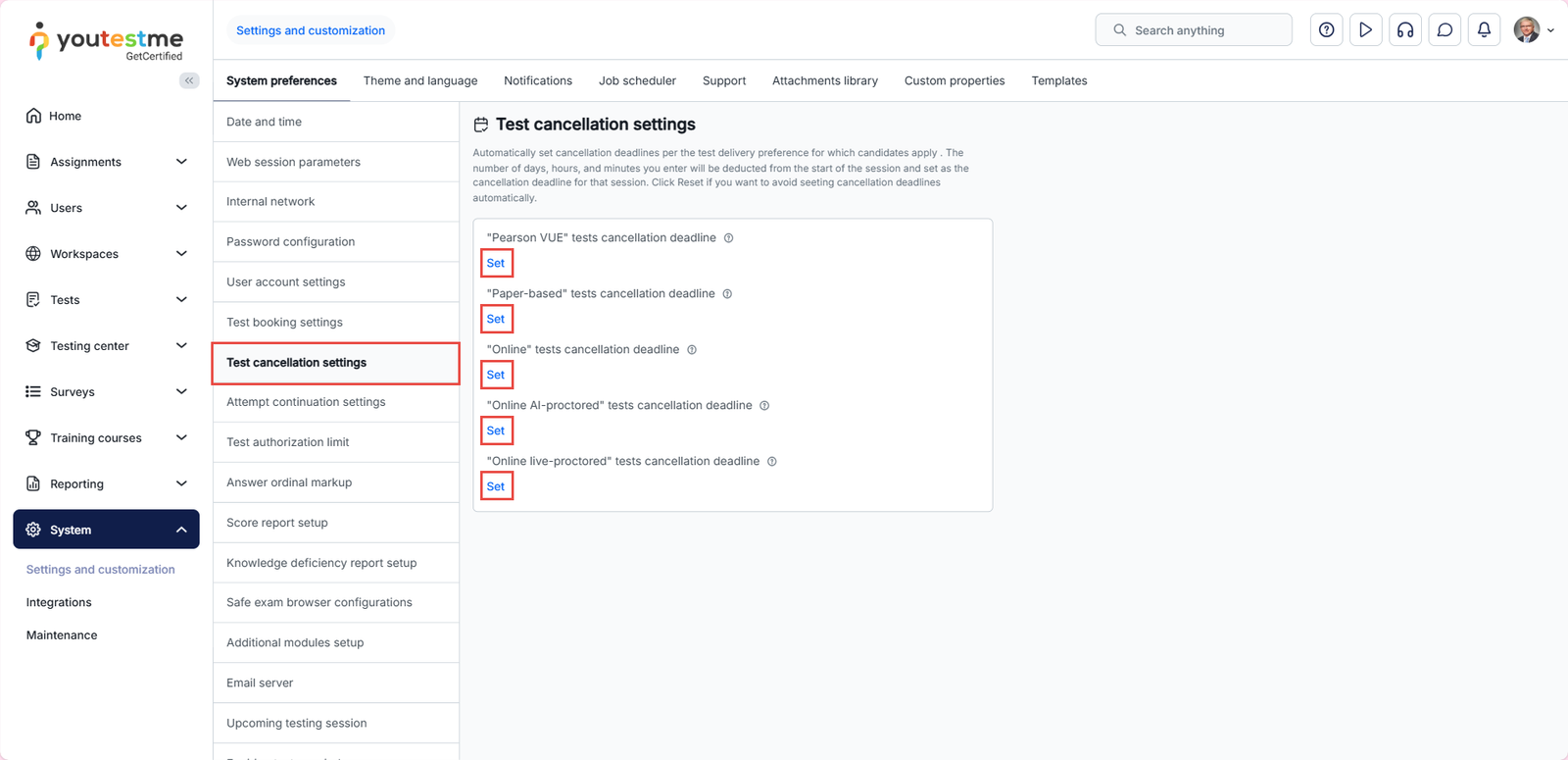 To automatically set booking and cancellation deadlines depending on the test delivery preference, navigate to the System in the main menu and click on Settings and Customization.
