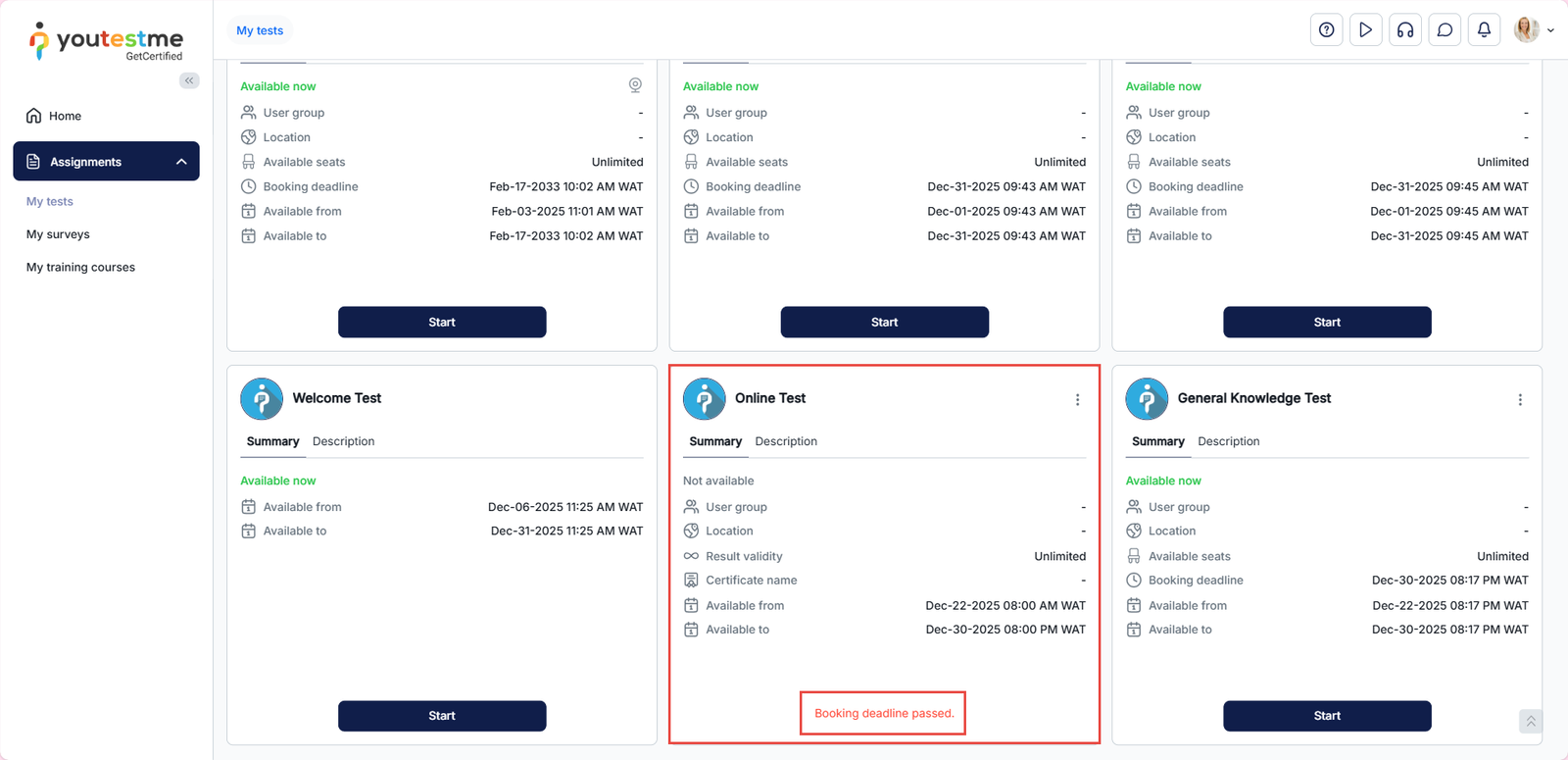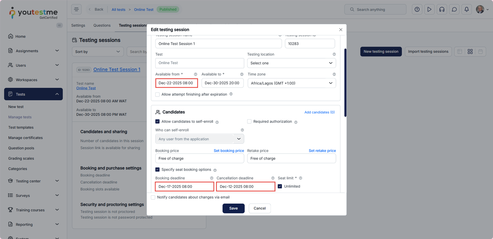 Once the booking and cancellation deadlines are configured, they will automatically appear when you set a Start time while creating a testing session.
