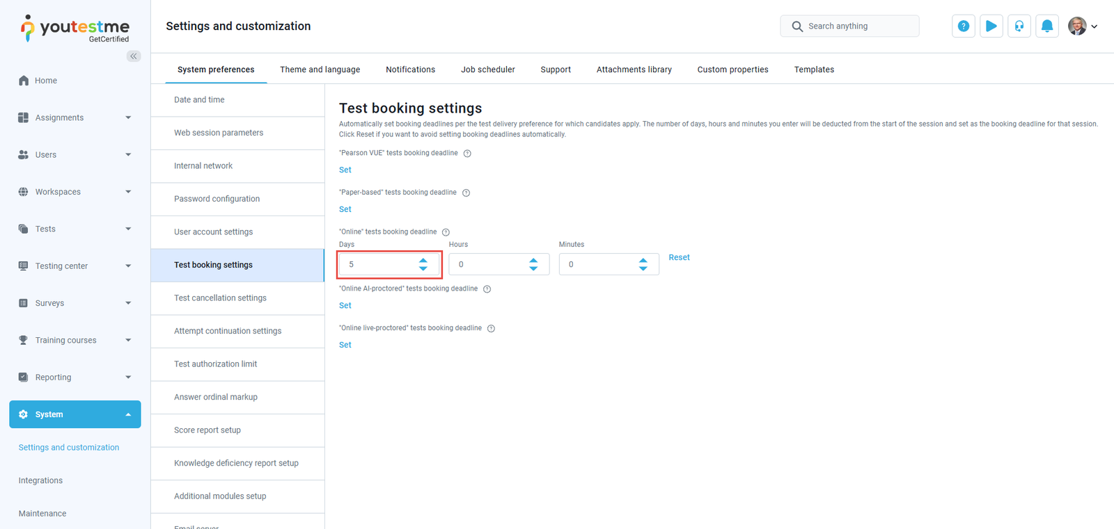 To automatically set booking and cancellation deadlines depending on the test delivery preference, navigate to the System in the main menu and click on Settings and Customization.