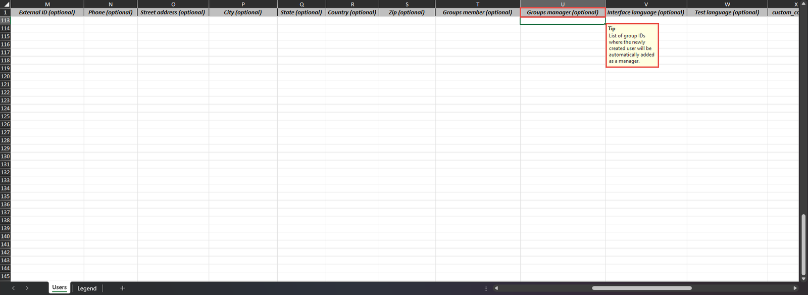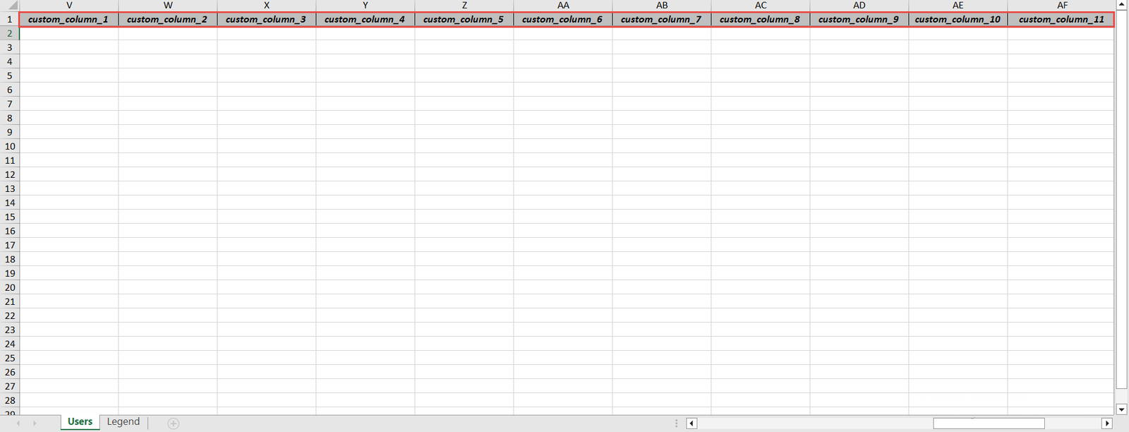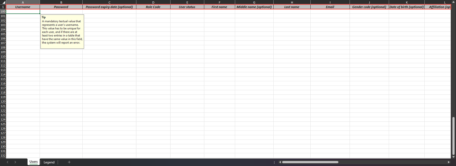 The Excel template contains a sheet where you should enter users’ personal and account information.