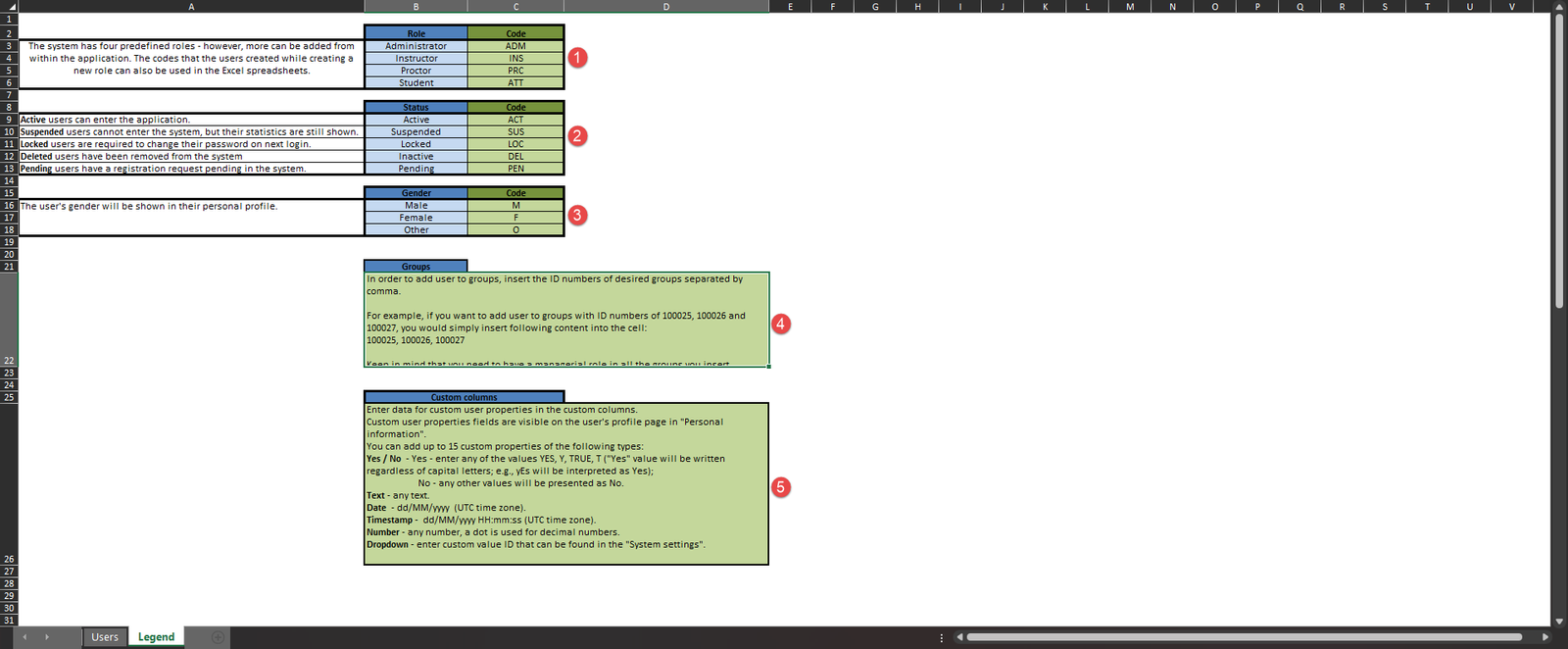 The second sheet is called Legend. It provides explanations and instructions for filling in fields that require predefined codes, specifically: