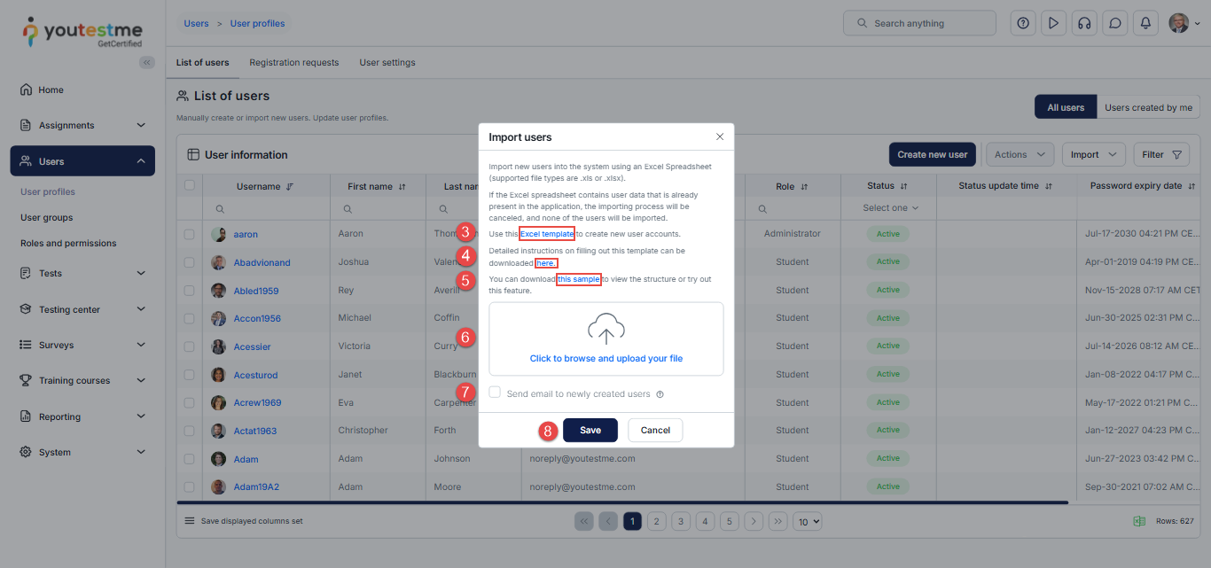 - In the pop-up window, click on the text Excel template to download a predefined file. Filling in the template according to the set rules is required to import user data successfully.