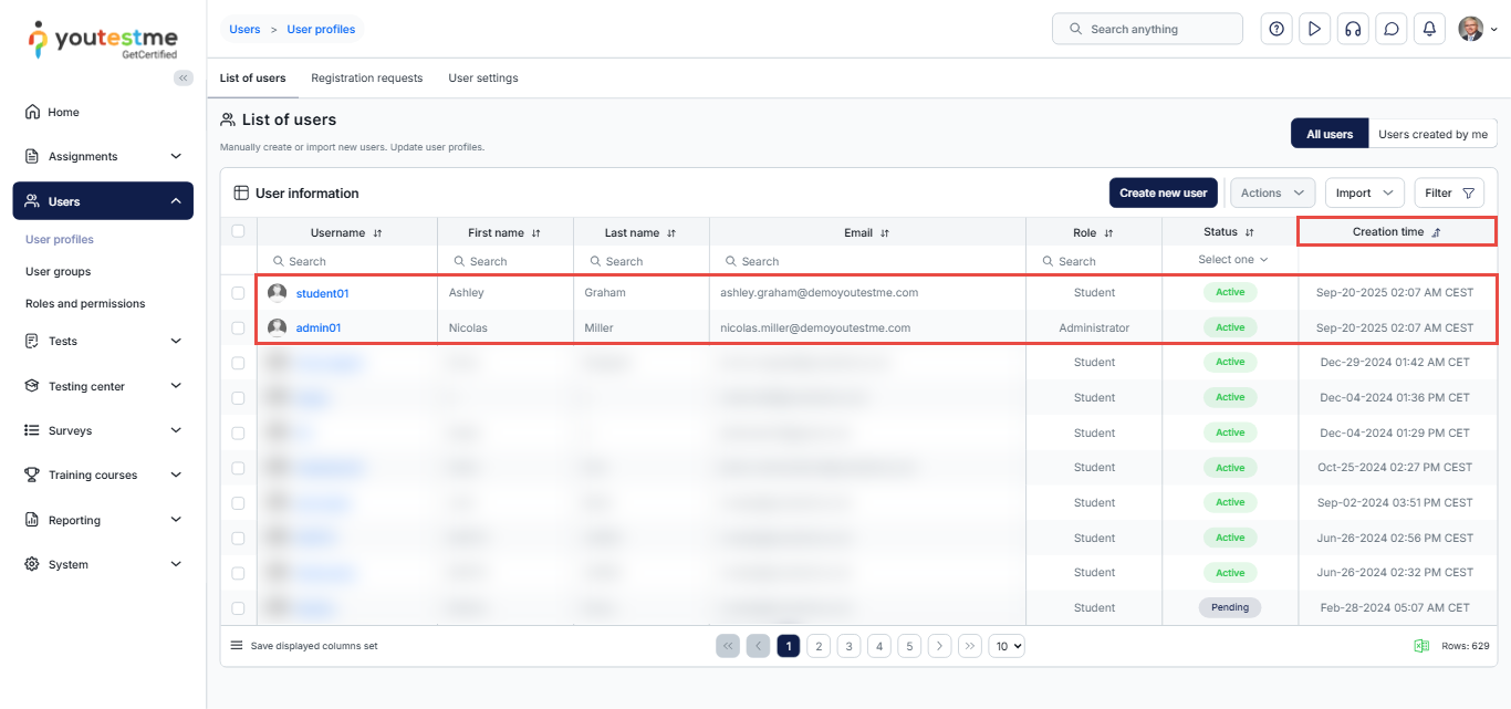 After uploading the Excel file, you can view the imported users by sorting them by Creation Date in descending order.