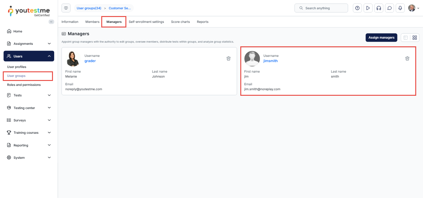 After uploading the Excel template, navigate to the User groups tab and search for the ID set in the template. Then, click the Managers tab to view all managers in the selected group.