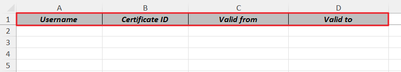 In the Excel file, enter the username of the user to whom you want to add the certificate, the certificate ID, and the certificate’s validity period.