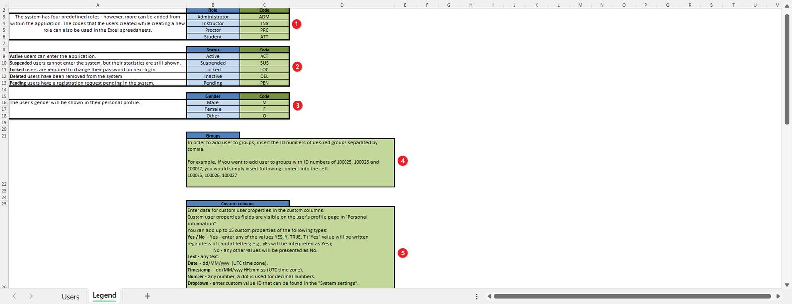 The second sheet contains the Legend. It provides explanations and instructions for filling the fields that require predefined codes, specifically: