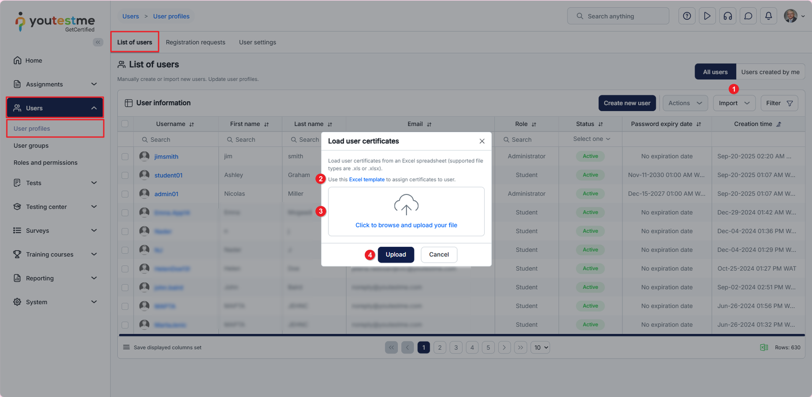 Note: If the Excel file contains errors, the entire operation will be canceled, and no certificates will be assigned.