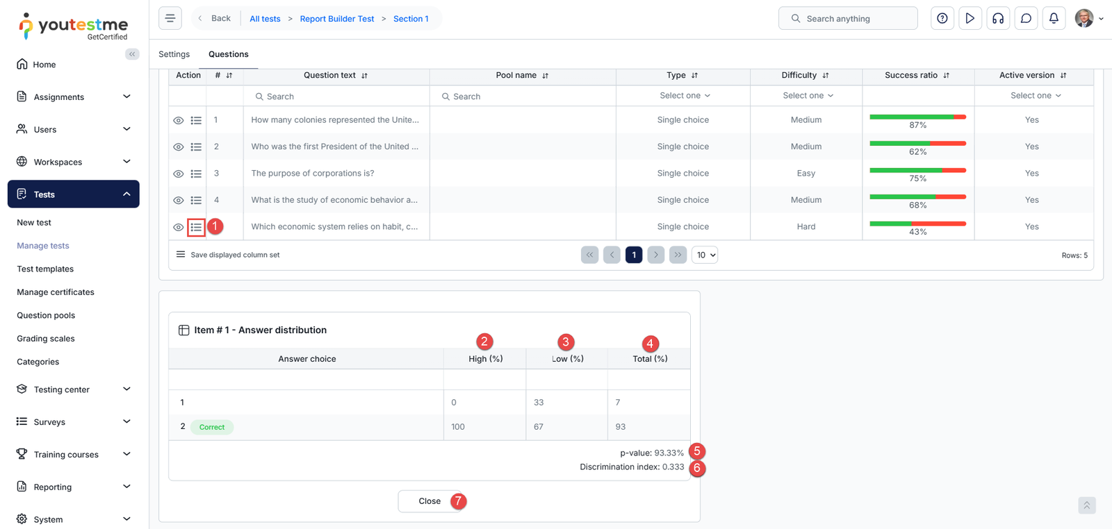 Note: For manually created tests, selecting the Edit questions button generates a new test version. As a result, Answer Distribution data will not be available for that version until at least 10 test attempts have been completed.