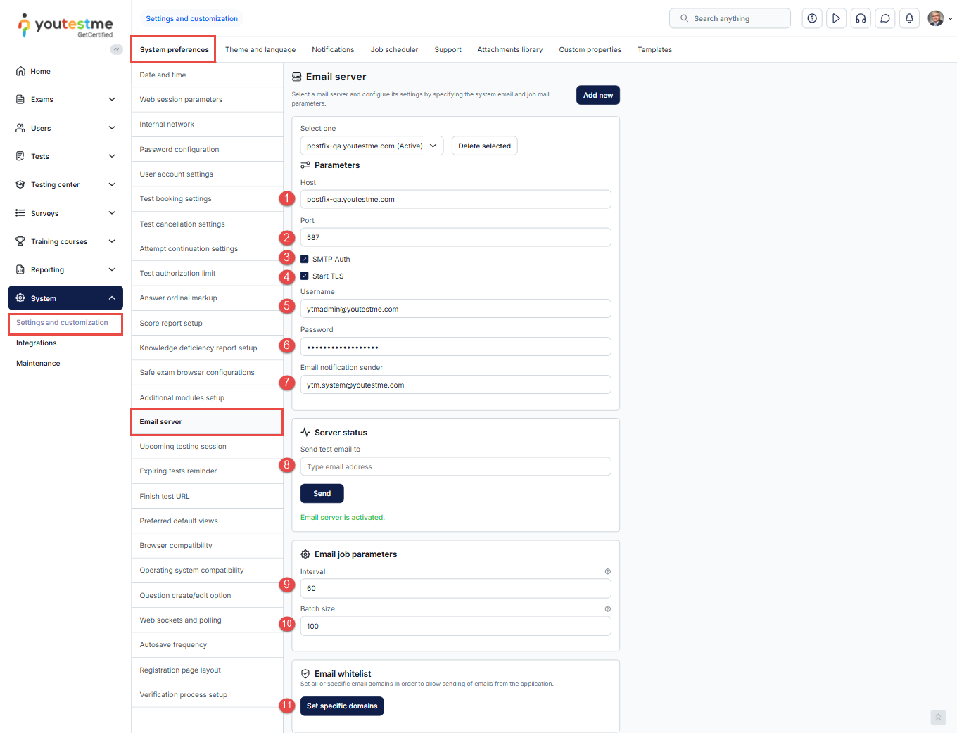 - Review and update the mail server parameters if necessary.