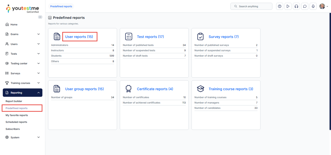 Select the Reporting tab, click the Predefined reports tab, and select the User reports page.