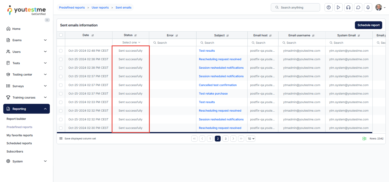 Open the Sent emails report. In the report, you can see the status of all emails from the application. The status should be Sent successfully if the mail server is set well.