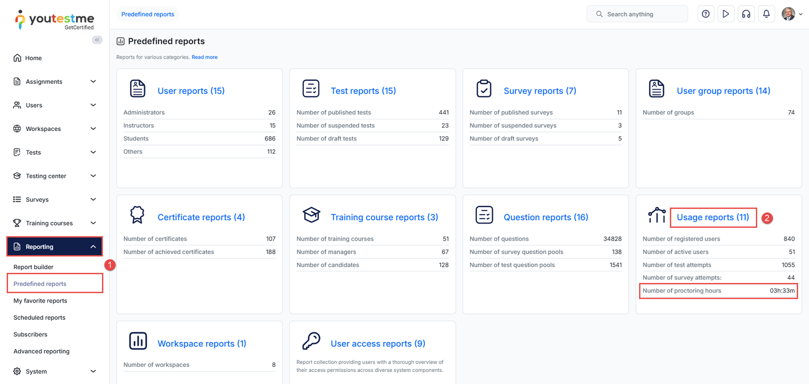 In this article, you will learn how to access and manage predefined reports related to proctoring usage. These reports provide insights into total proctoring hours and user-specific proctoring minutes, which can help with monitoring, auditing, and planning.