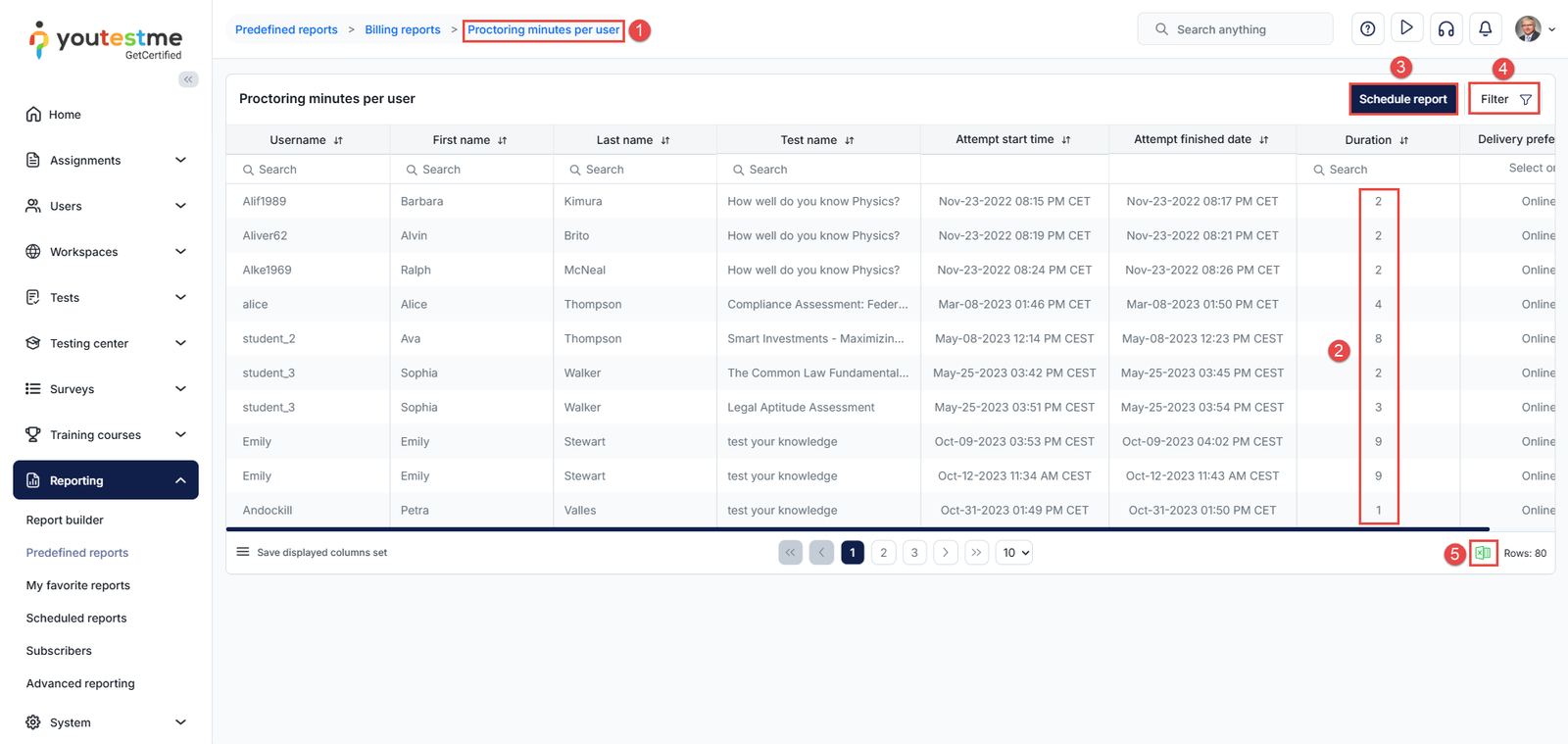 - Check the proctoring minutes used per user to get a detailed usage summary.