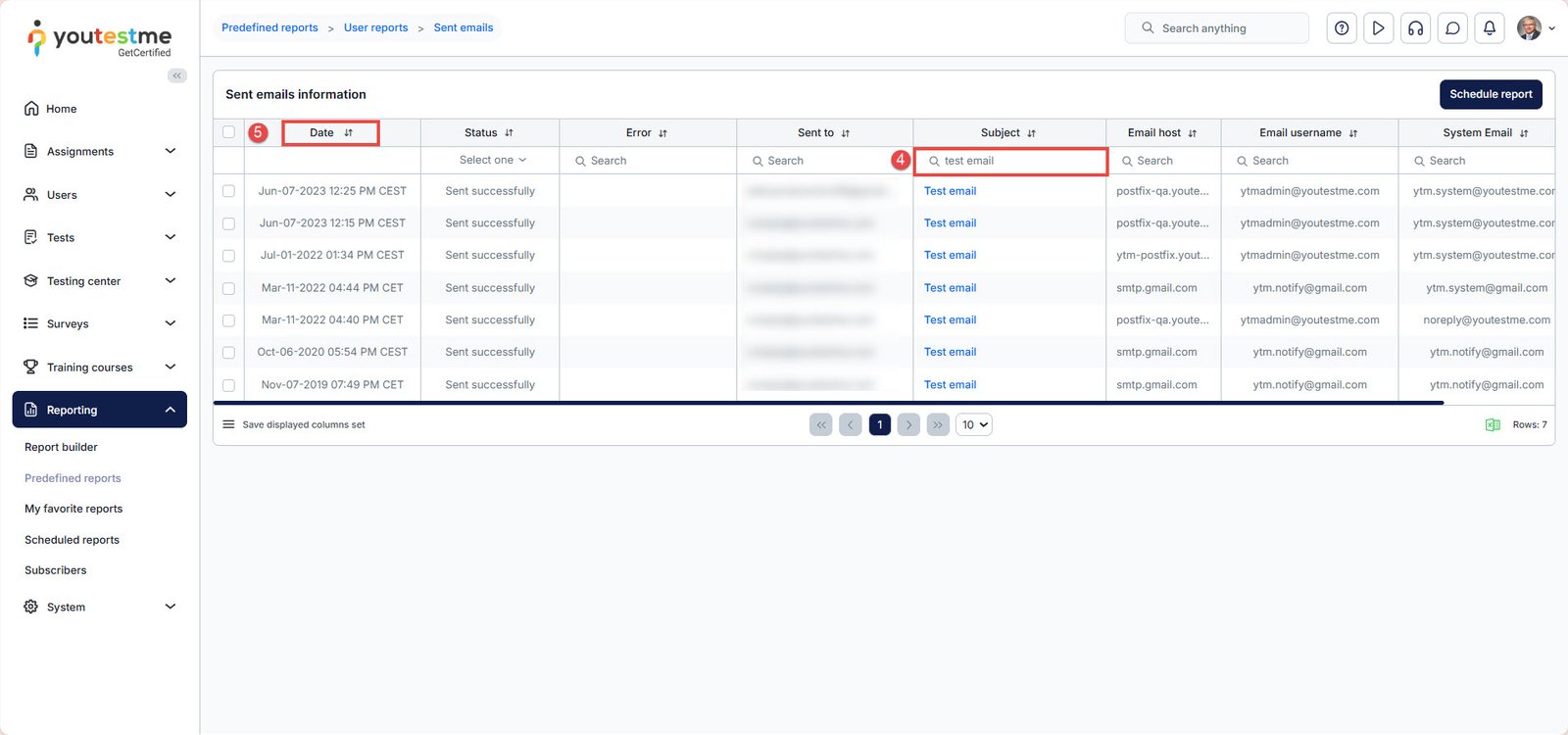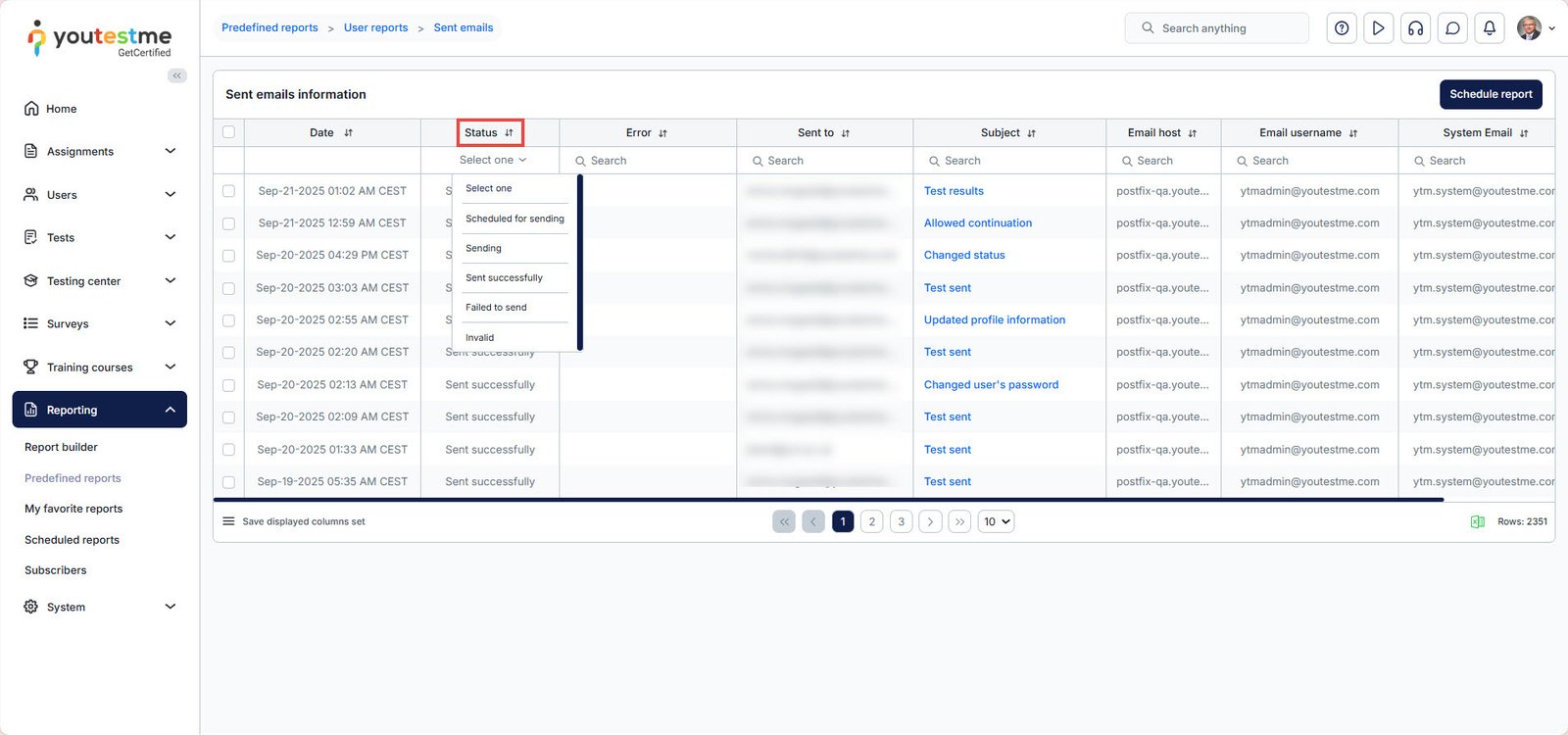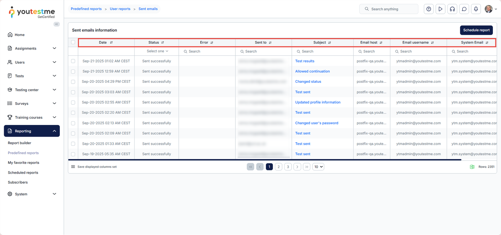 - Search for the email with the subject Test email and check if its status is Sent successfully. If you cannot find these emails or the status is something other than Sent successfully, contact our support team.