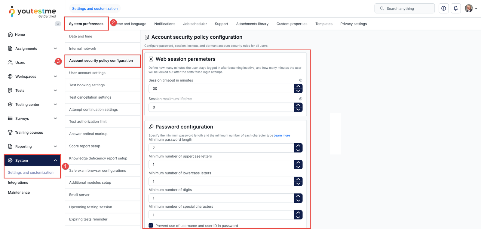 Account Security Policy Configuration allows administrators to enforce password and account protection rules that ensure user privacy and secure access to the system. These policies help protect accounts by controlling password complexity, login attempts, session duration, and account inactivity.
