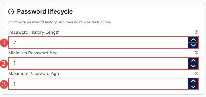 The Password Lifecycle section allows administrators to configure password history and password age restrictions.