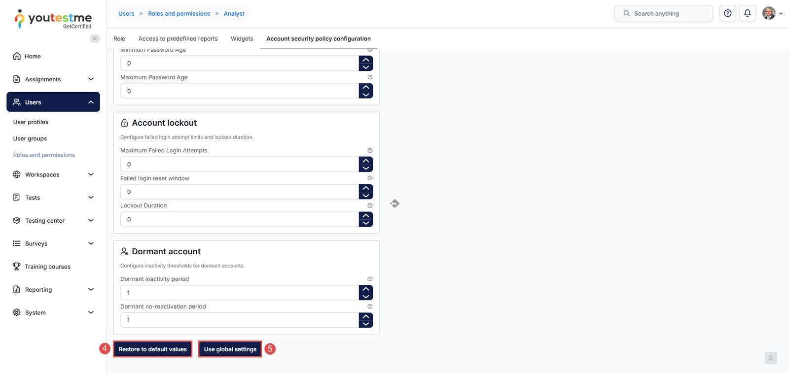 - Use Global Settings – Applies the security policy configured at the system level. This option becomes available after a role-level modification has been saved and allows administrators to revert the role to follow the global system policy.