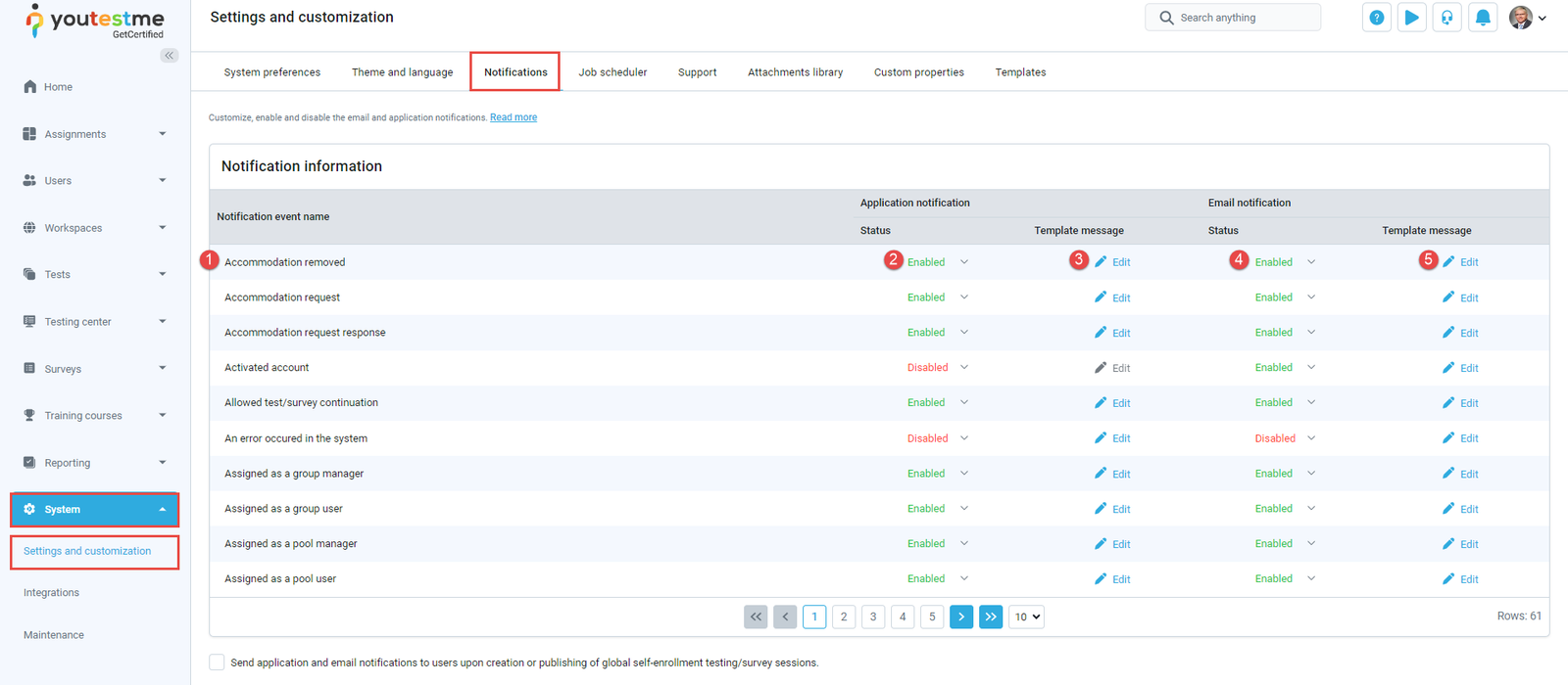 - Click on Edit to customize Application notification – edit the template message shown in the application after the specific action is made.