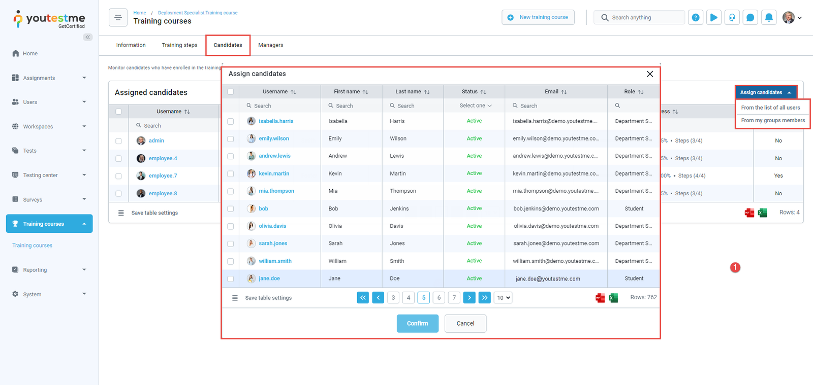 - Assigned as a training course user – The notification triggers when you Training courses page, select the training, move to the Candidates tab, select user(s) from the list, and click the Confirm button. After the action is performed, you are assigned as a training course user. You will receive an email and in-app notification with the training course details.