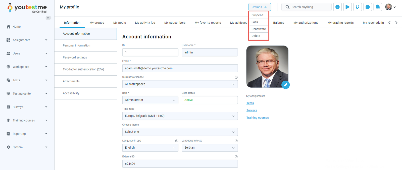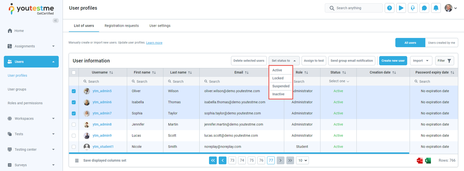 - User’s status changed – The notification triggers when you select one user in the system and change their status in the application to Suspended, Locked, Deactivated, or Deleted. The user will receive an email notification that their status has been changed to any of the mentioned statuses.