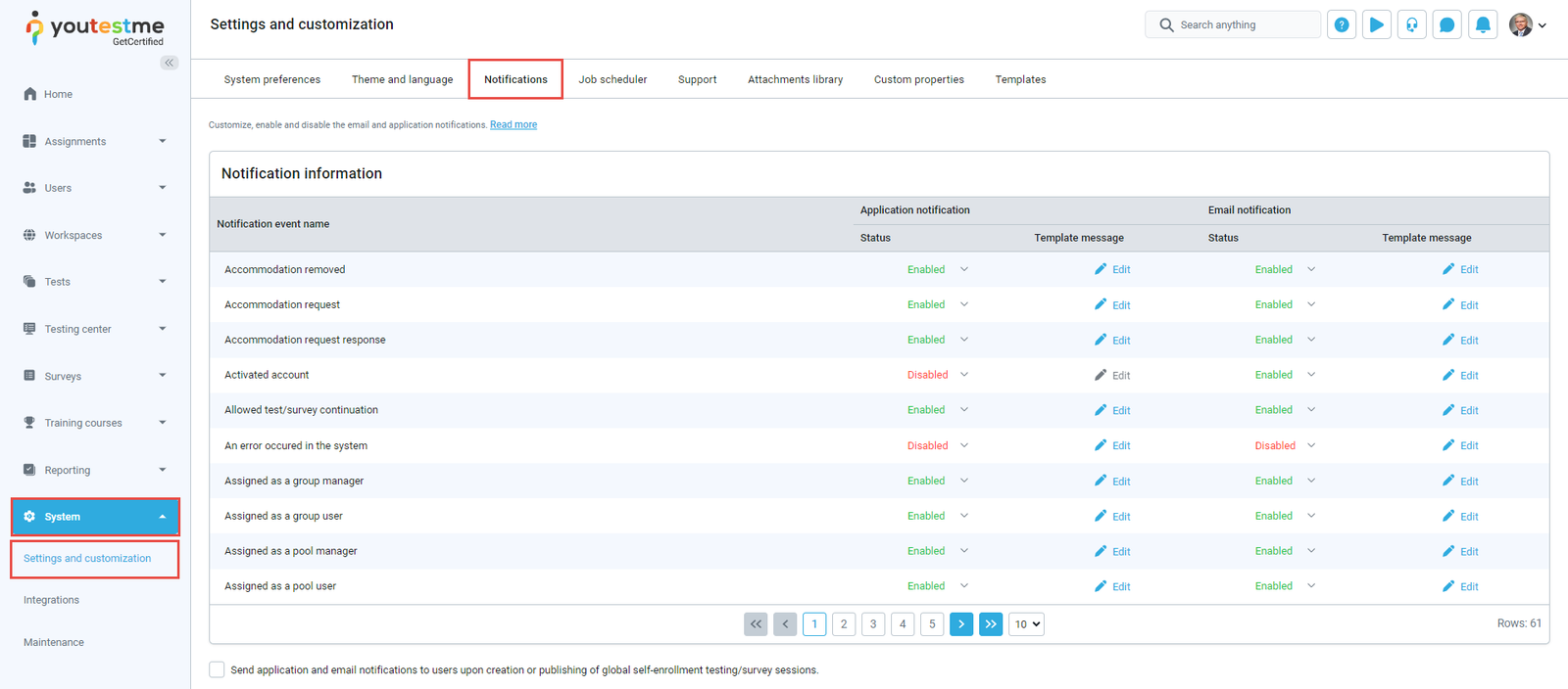 The Notification tab contains templates for email and application notifications that are automatically sent when a particular action is made inside the application.