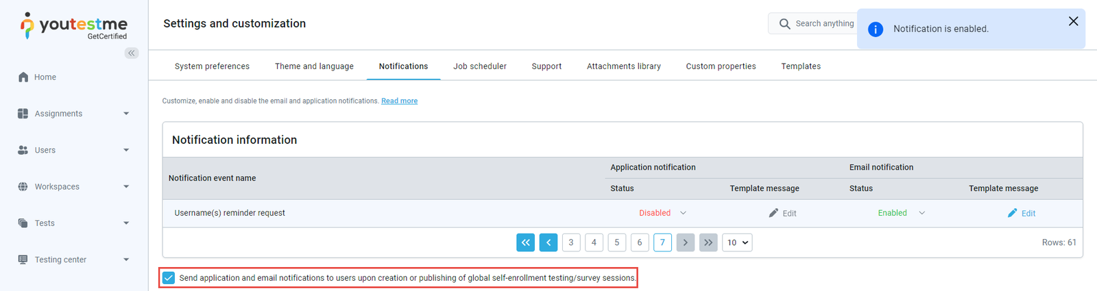 By enabling this option, an email notification will be sent to the application users upon publishing a global self-enrollment session that is available for taking or upcoming.