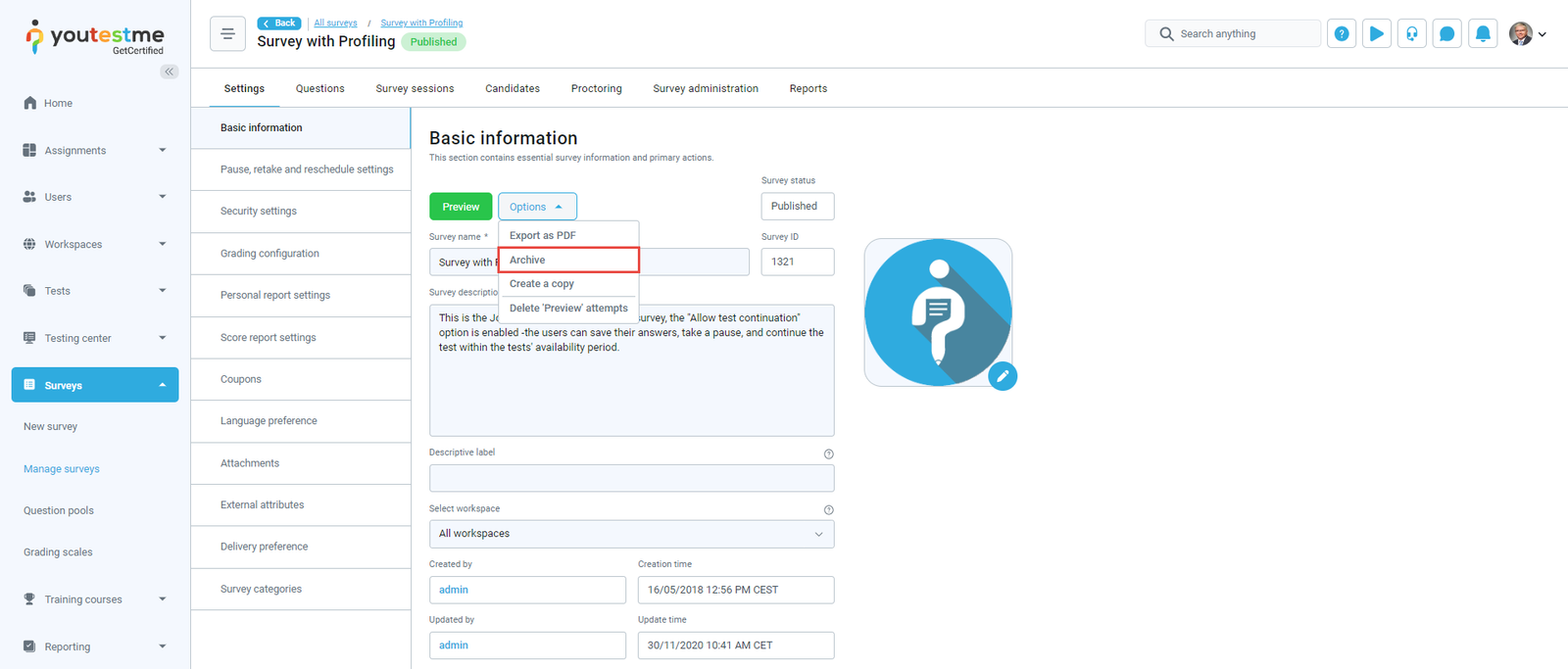 - Survey archived – The notification triggers when the survey manager visits the Surveys/Manage surveys page, selects the survey, and chooses the Archive option, suspending the survey. After suspending the survey, the user assigned to a currently active survey session will receive an email and in-app notification containing the message that the survey has been suspended.