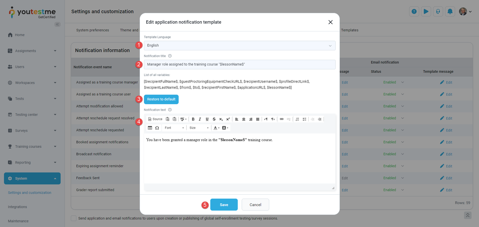 - Change the Notification text (body). You can customize the text except for the one between the $ signs. This part of the text cannot be modified as the system uses variables to insert user-related data.