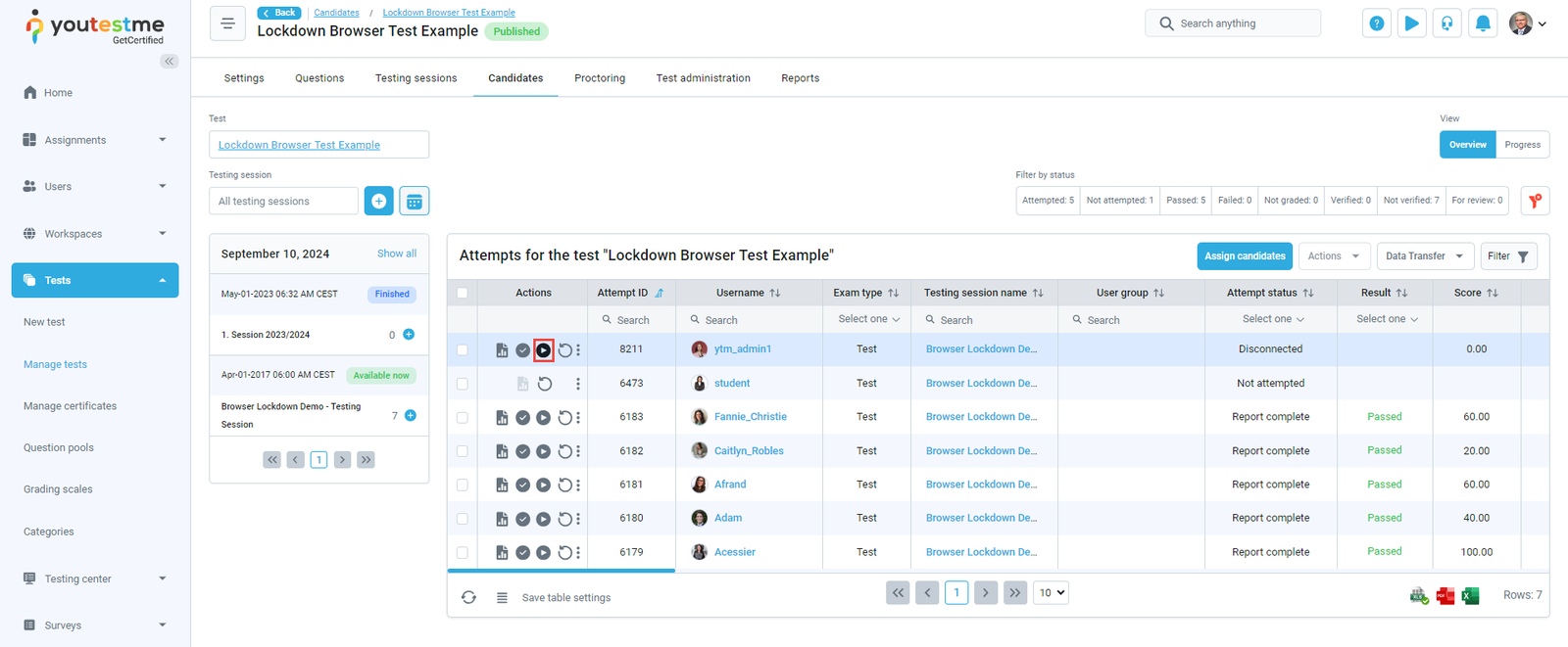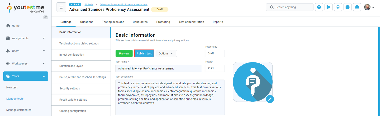 - Test published – The notification triggers when the instructor completes the test creation process, creates the testing session, and clicks the Publish test button to make the test visible to the candidates. When the test manager assigns you to the testing session, you will receive an email and in-app notification containing the test details.