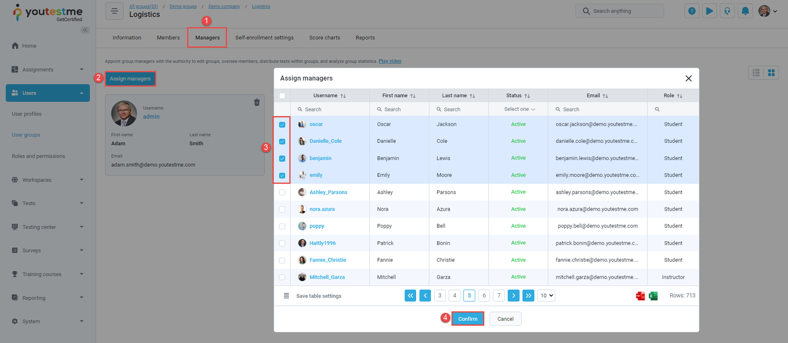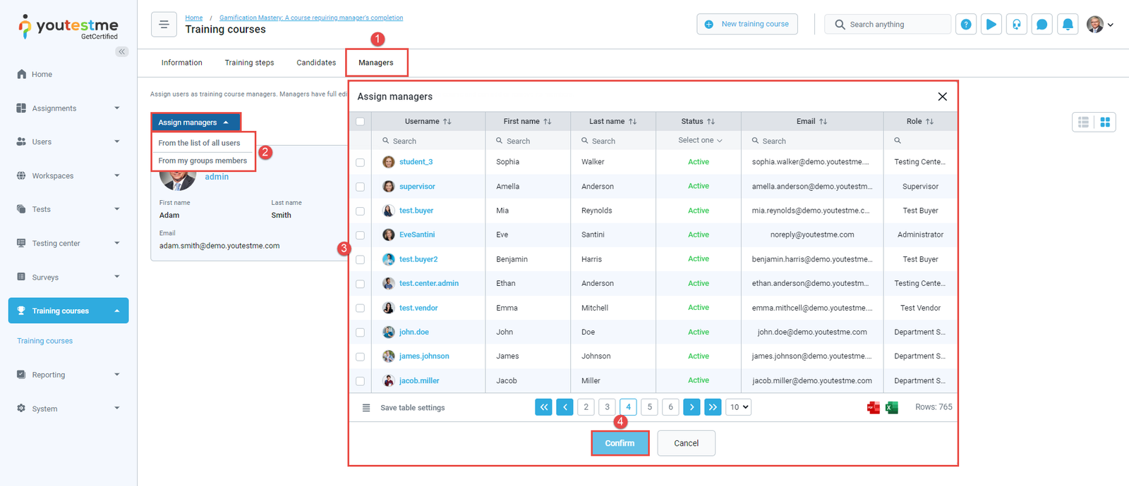 - Assigned as a training course manager – The notification triggers when you are assigned as a manager of a training course. Visit the Training courses page, select the training, move to the Managers tab, the Assign managers tab, select user(s) from the list, and click the Confirm button. After the action is performed, the user is assigned as a training course manager, and they will receive an email and in-app notification with the details of the training course you manage.