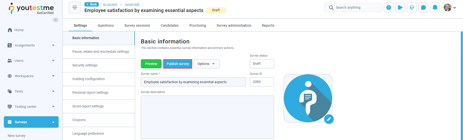 - A survey published – The notification triggers when the instructor completes the survey creation process creates the survey session and clicks the Publish survey button to make the survey visible to the candidates. When the survey manager assigns you to the survey session, you will receive an email and in-app notification containing the survey details.