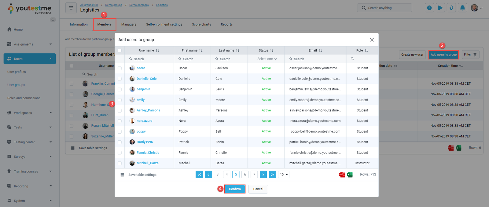 - Assigned as a group member – The notification triggers when you are assigned to a particular user group. Navigate to the group, and in the Members tab, click the Add users to group button, select the user you will assign as a group member, and click the Confirm button. After the action is completed, the user is assigned as a group member, and he will receive the email and application notification with the group name.