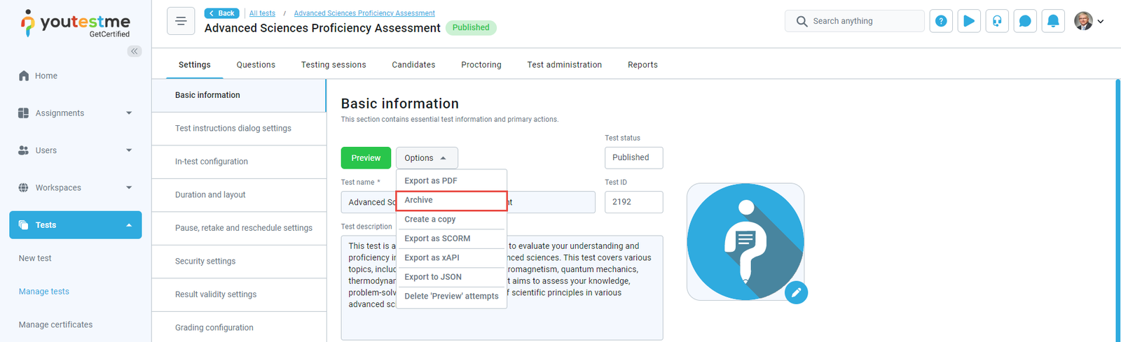 - Test arhived– The notification triggers when the test manager visits the Tests/Manage tests page, selects the test, and by choosing the Archive option, suspends the test. After it, the user assigned to a currently active test session will receive an email and in-app notification containing the message that the test has been suspended.