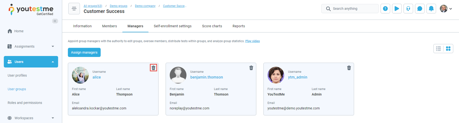 - Assigned as a group manager – The notification triggers when you are assigned as a user group manager. To assign a manager to the group, navigate to the Managers tab of the user group, click the Assign managers button, select the user you will assign as a group manager, and click the Confirm button. After the action is completed, the user is assigned as a group manager, and he will receive the email and application notification with the name of the group you manage.