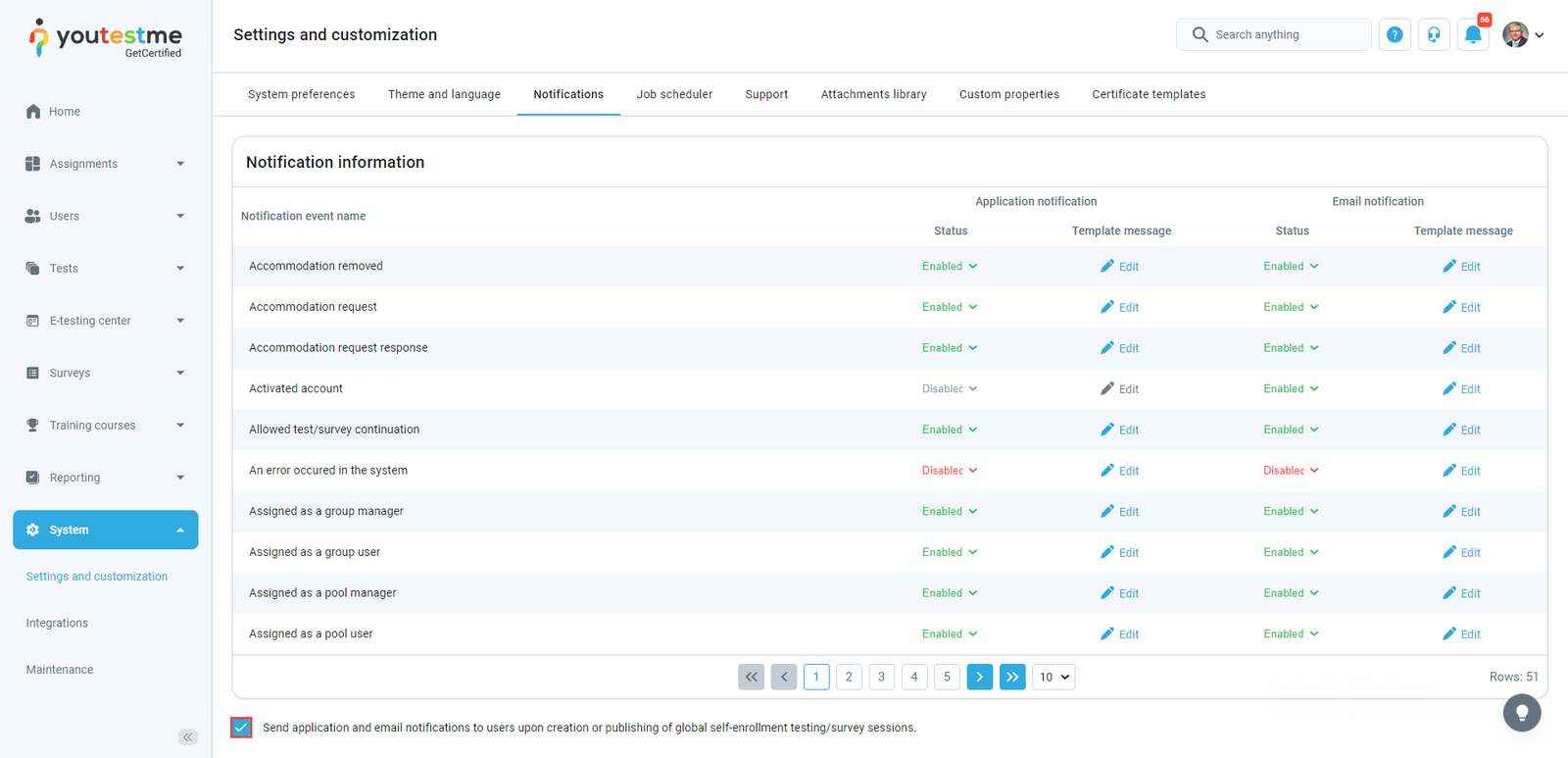 - Click on Edit to customize Application notification – edit the template message shown in the application after the specific action is made.