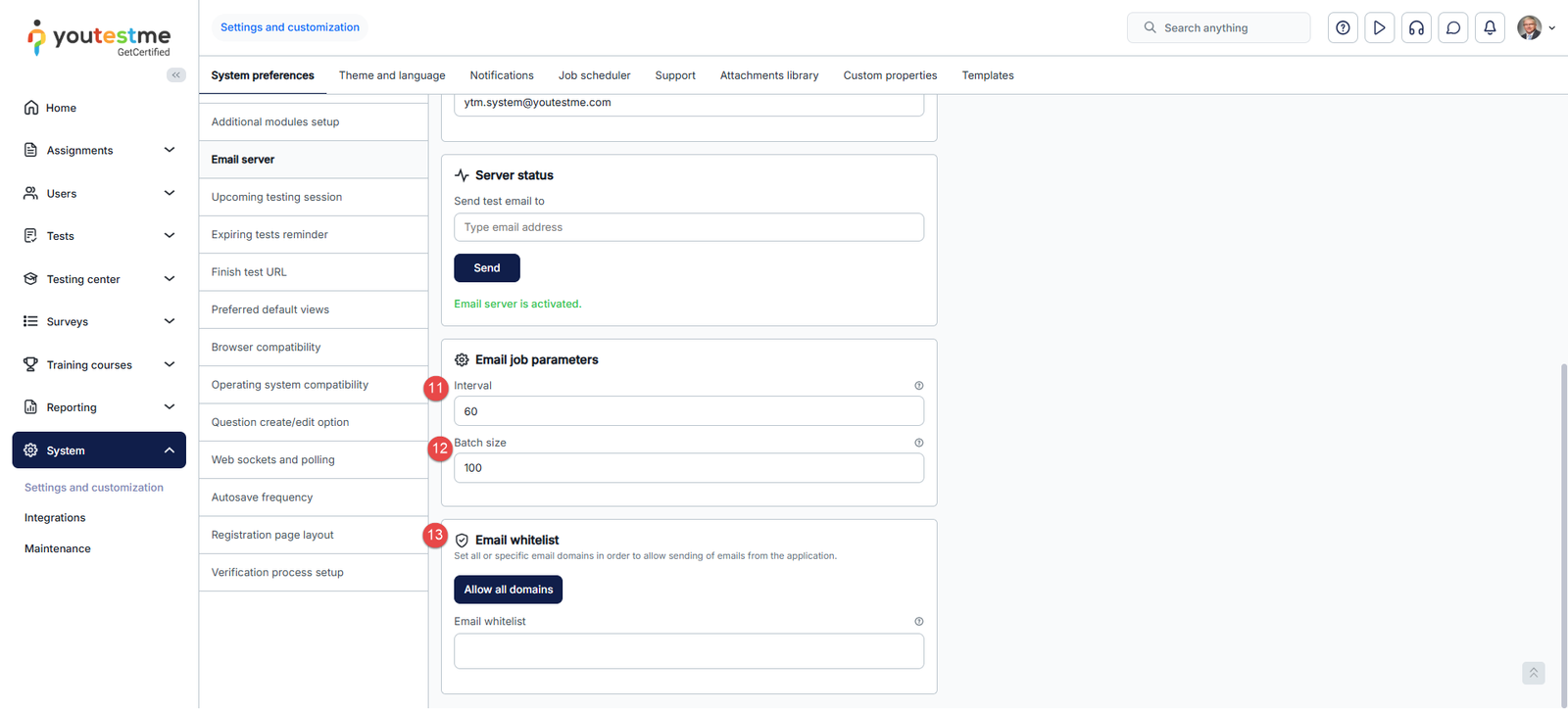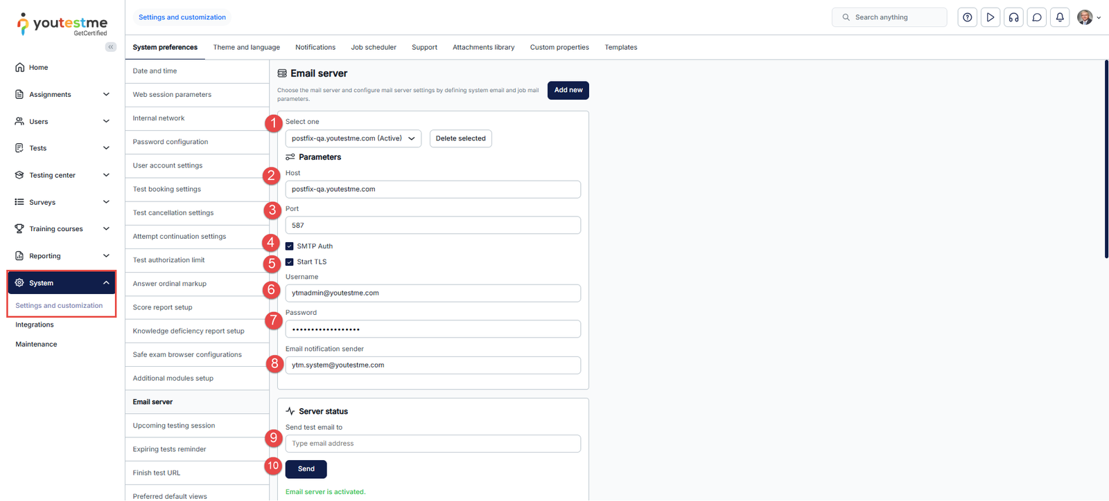 Proper configuration of the mail server ensures that your platform can send automated email notifications to administrators and users such as password resets, test invitations, and status updates.