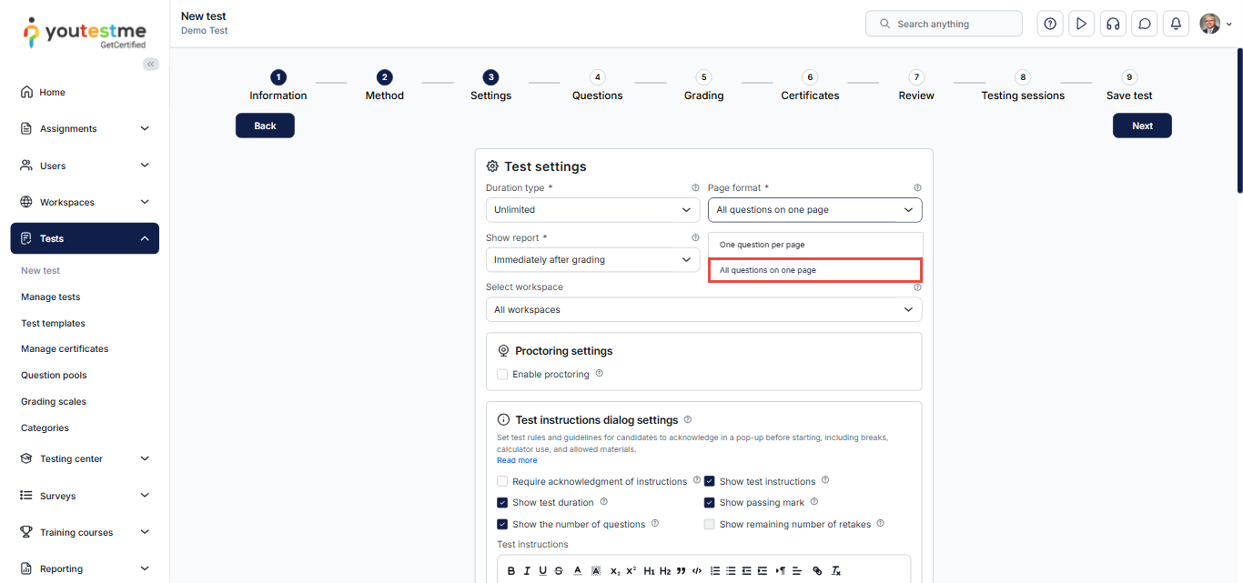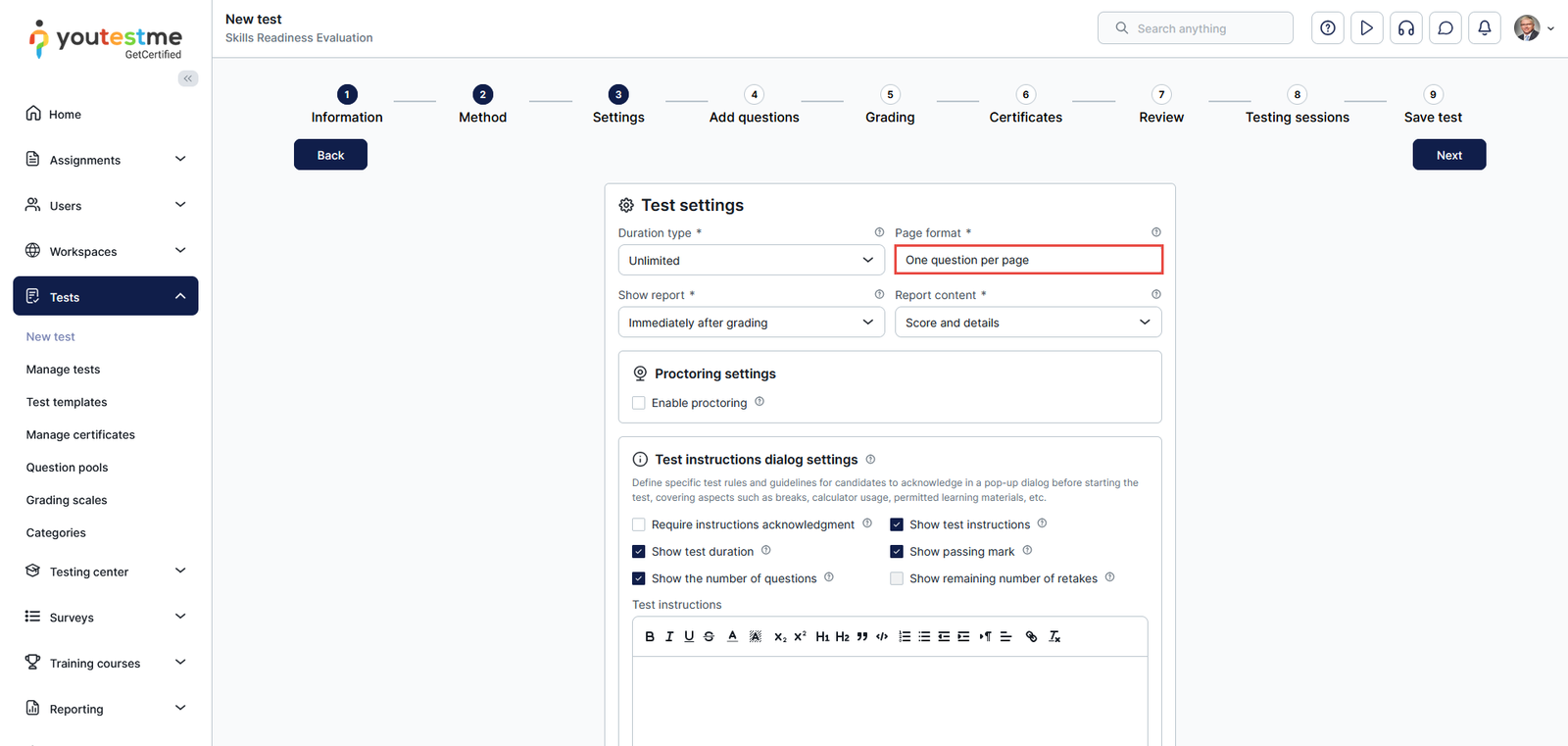 During the Settings step of the test creation process, the test creator configures key settings such as test duration, format, and report preferences.