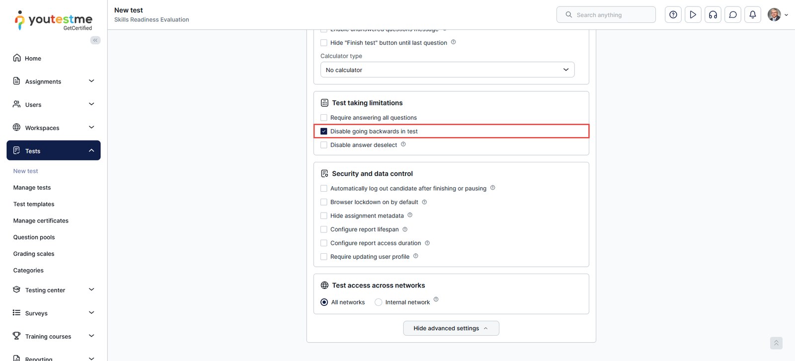 When the One Question Per Page option is selected, the test creator can enable a setting to prevent revisiting questions. This ‘Disable Going Backward In Test’ restriction ensures that test-takers cannot return to a previous question after clicking ‘Next Question’.