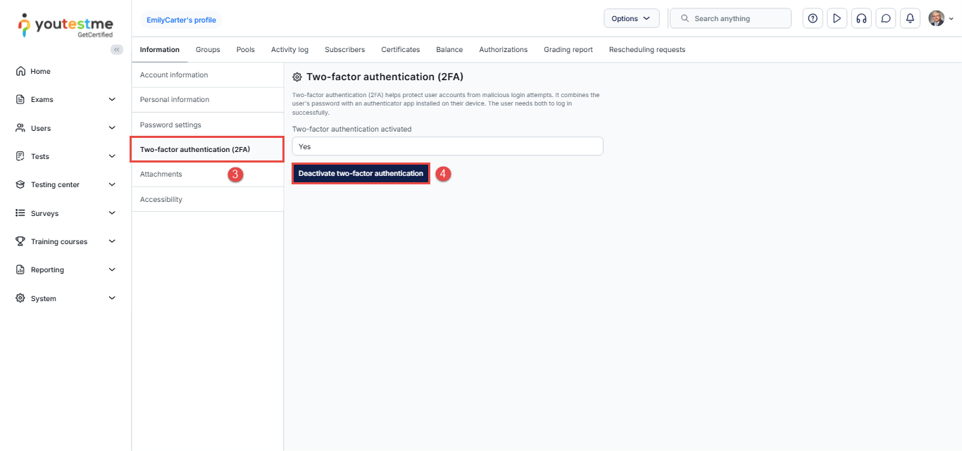 - On the user information page, navigate to Two-factor authentication (2FA).