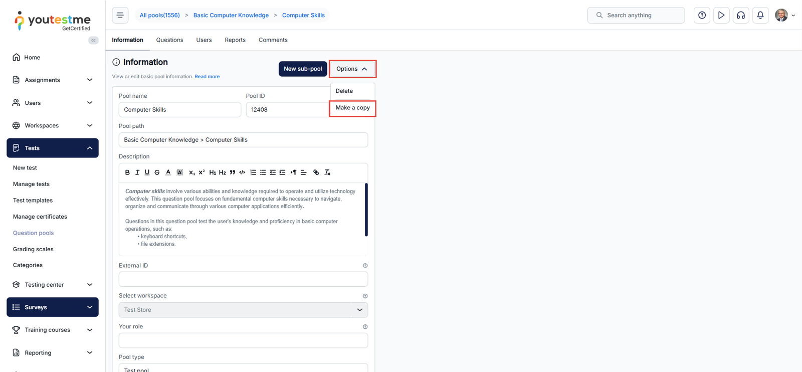 Once you are in the Question Pool page, click the Options button, and then select the ‘Make a Copy’ option
