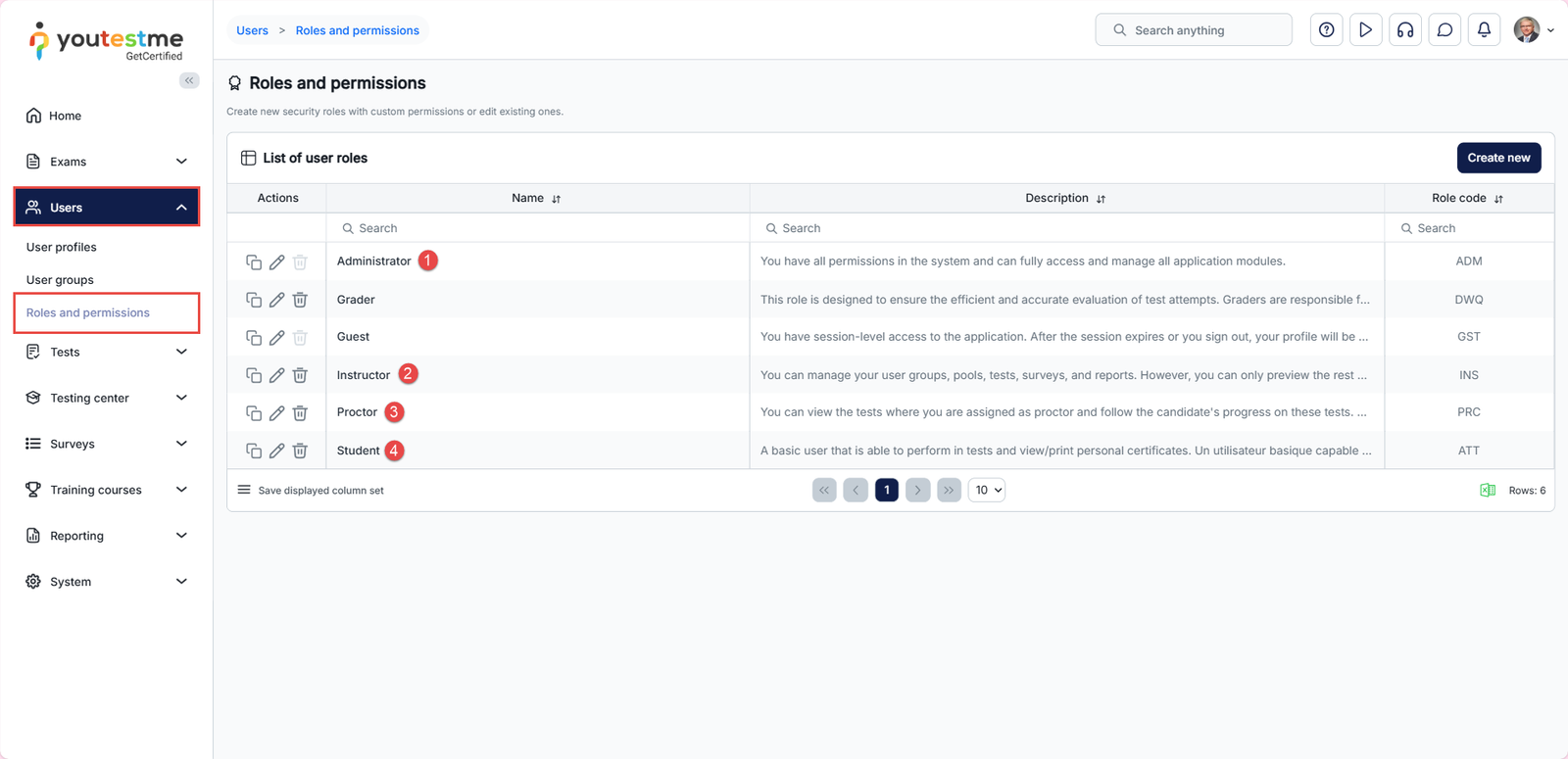 To access the Roles and permissions page, navigate to Users → Roles and Permissions. The system includes four predefined roles, each with a different level of access: