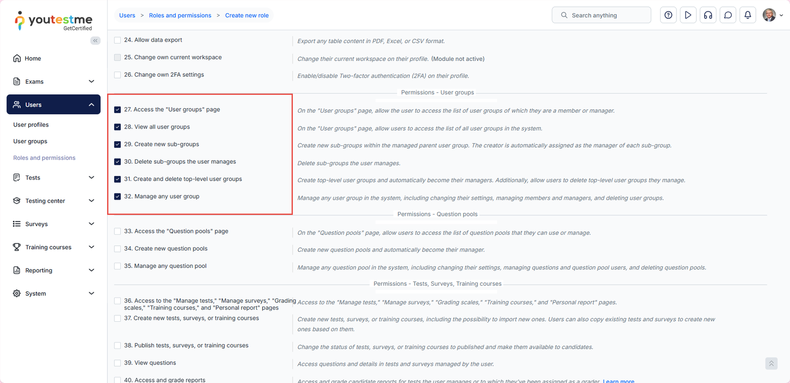 - Select the permissions you want the group manager to have. We suggest choosing permissions from 27 to 32. Permission 1 is selected by default.