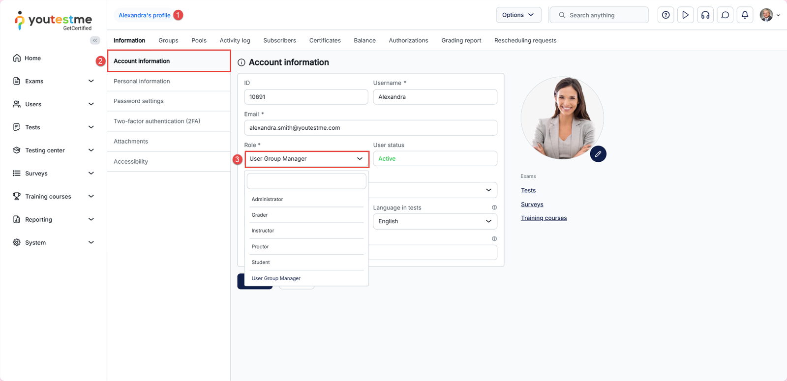 - Instructor – A role with higher-level permissions than a regular user, instructors can manage their groups, question pools, tests, and reports, while only previewing the content not managed by them.