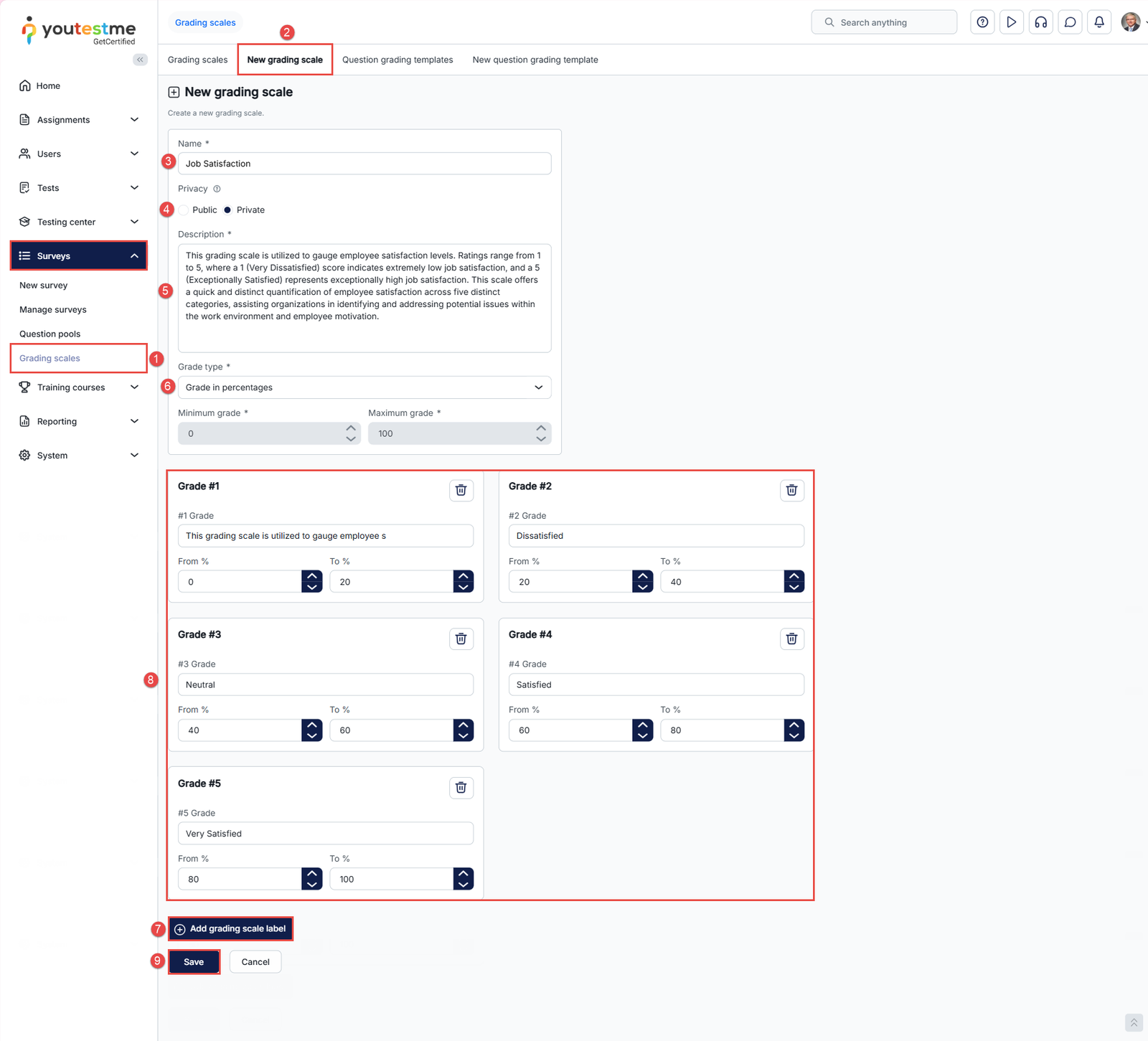 Before diving into the survey creation process, creating a grading scale complete with defined grades is essential. This grading scale will be utilized to gauge employee satisfaction levels.
