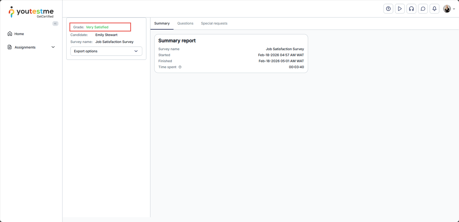Once scheduled, published, and assigned to candidates, the survey will be visible on the My surveys page, allowing candidates to participate within the specified date and time parameters you’ve set.