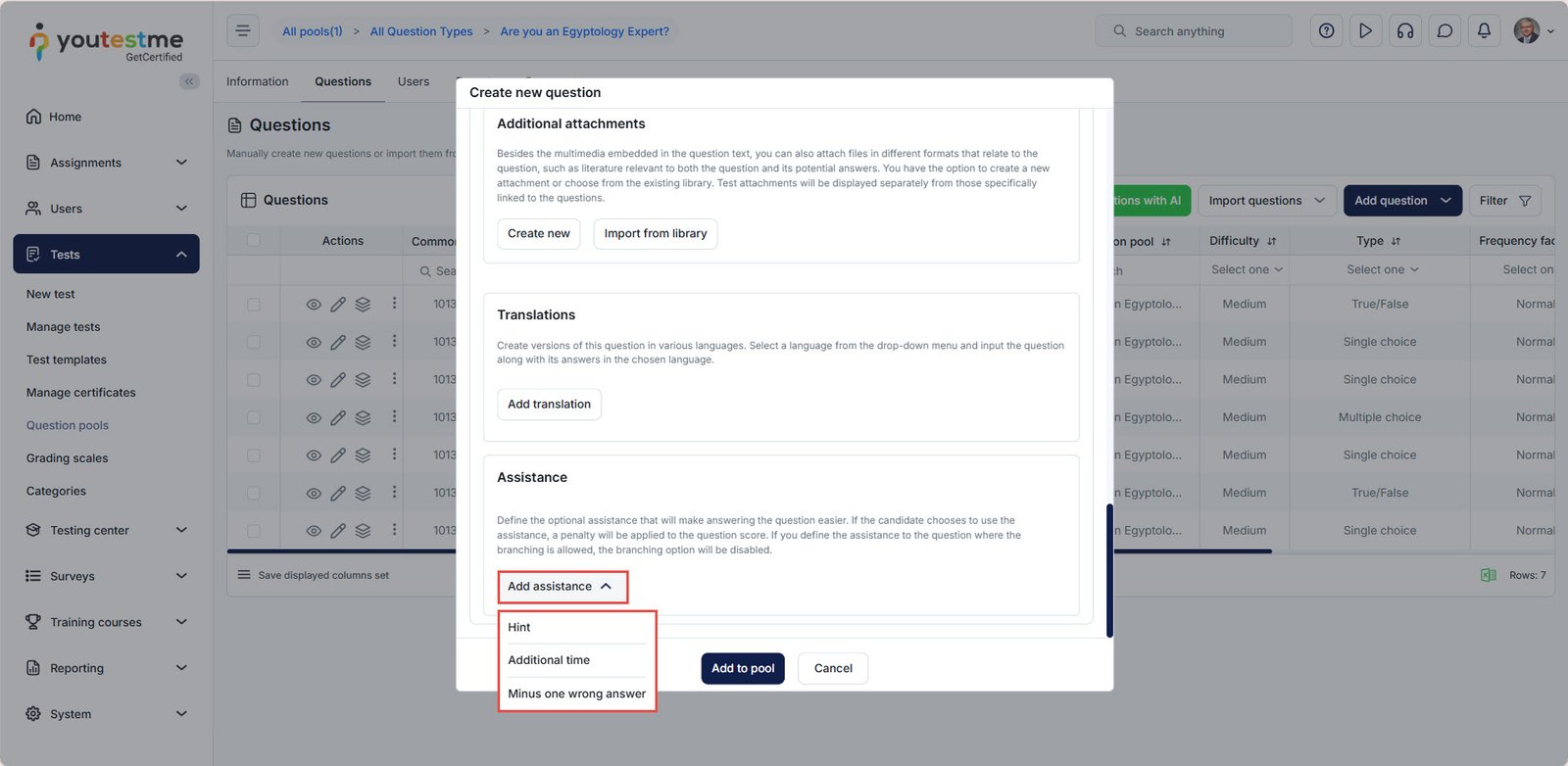 This article explains how to create a new question within an existing question pool. By adding questions directly to a pool, you can expand your test content, improve question variety, and ensure that your assessments remain up-to-date and aligned with your testing strategy. The following steps guide you through the complete process, from selecting a pool to configuring question content, scoring, and optional assistance settings.