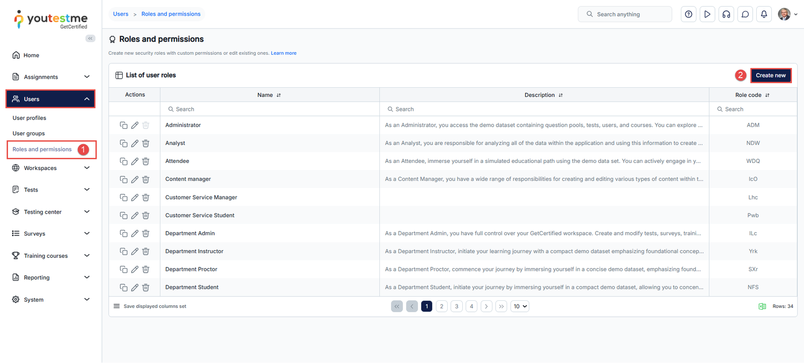 The user role represents a set of permissions assigned to users, determining their access to various application parts. A user can be granted permission to manage certain objects within the application (test, pool, group, survey, etc.) without needing a global role for managing said module. Users can create custom roles and manually select the permissions they want those roles to contain. Only specific users can create new roles and assign them to other users. The permission to create roles is ”Manage a role,” and the permission to assign roles to other users is ”Grant roles to users.”