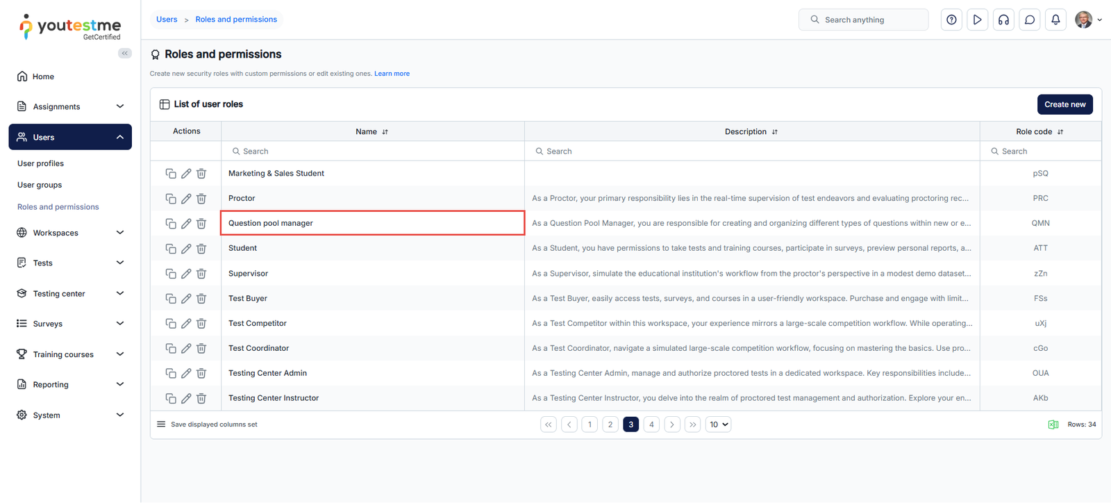 When you create a Question pool Manager role, you can find it listed on the Roles and permissions page within the Roles table.
