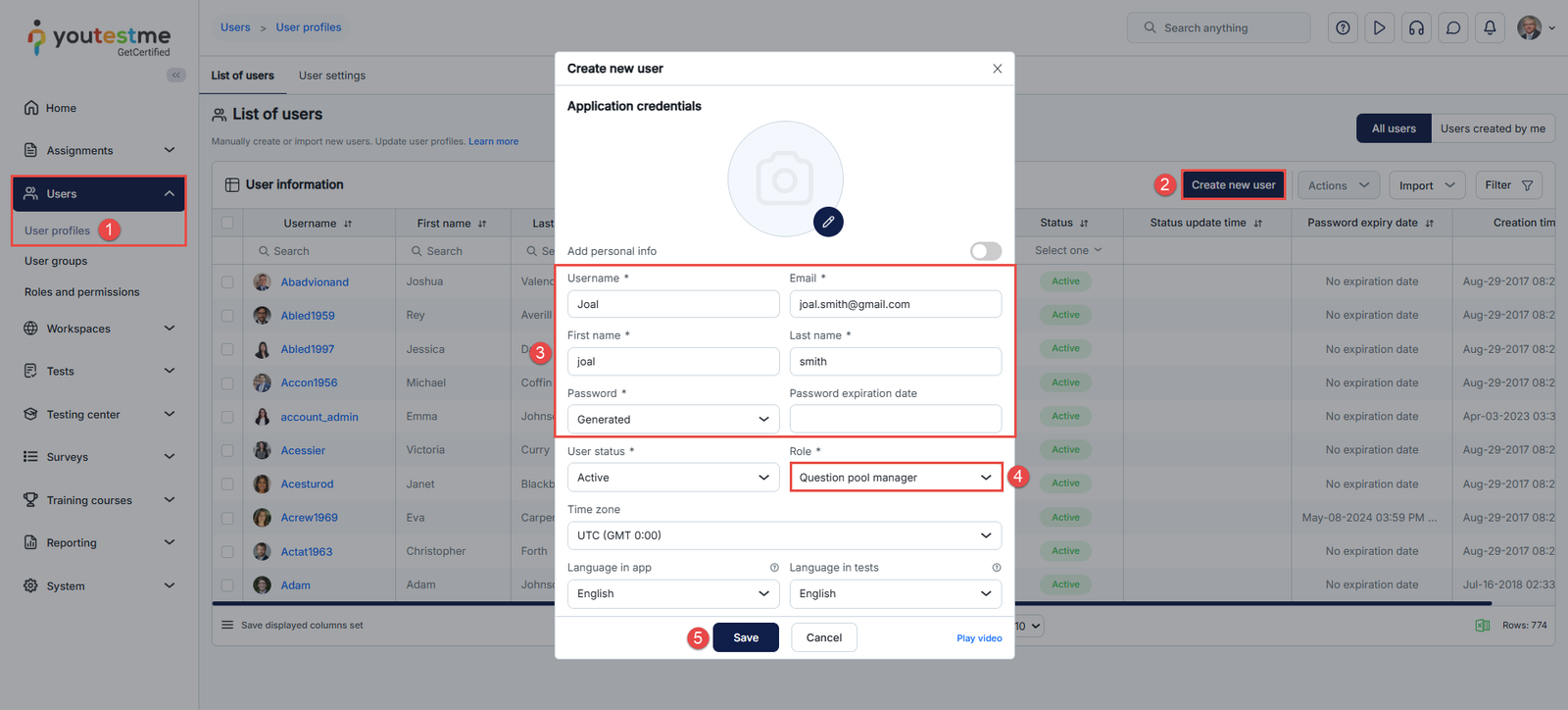 Creating a New User with Question Pool Manager Security Role