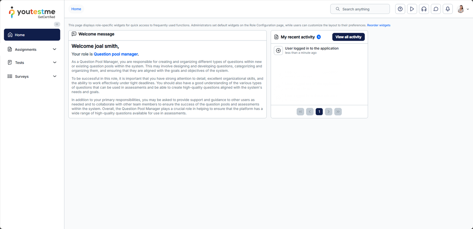 When you log in as a newly created user with the Question pool Manager security role, you will be redirected to the Home page.